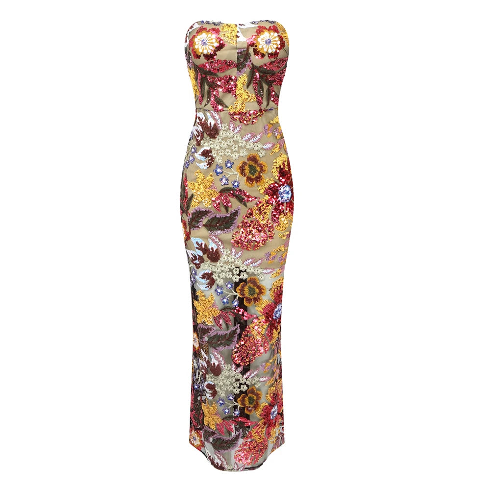Trend4us Luxe Strapless Floral Sequin Sheer Maxi Dress