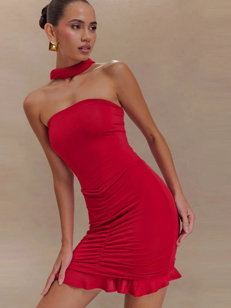 Trend4us Modern Rosette Sculpted Halter Mini Dress