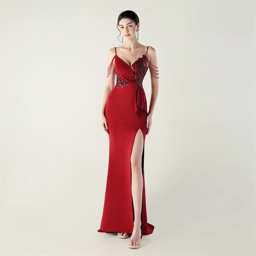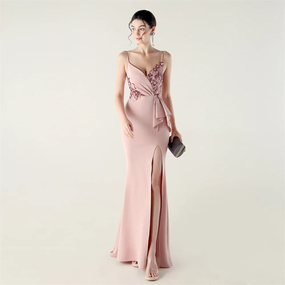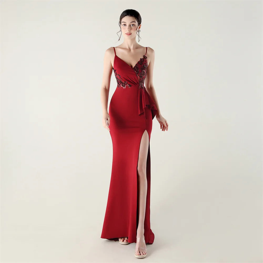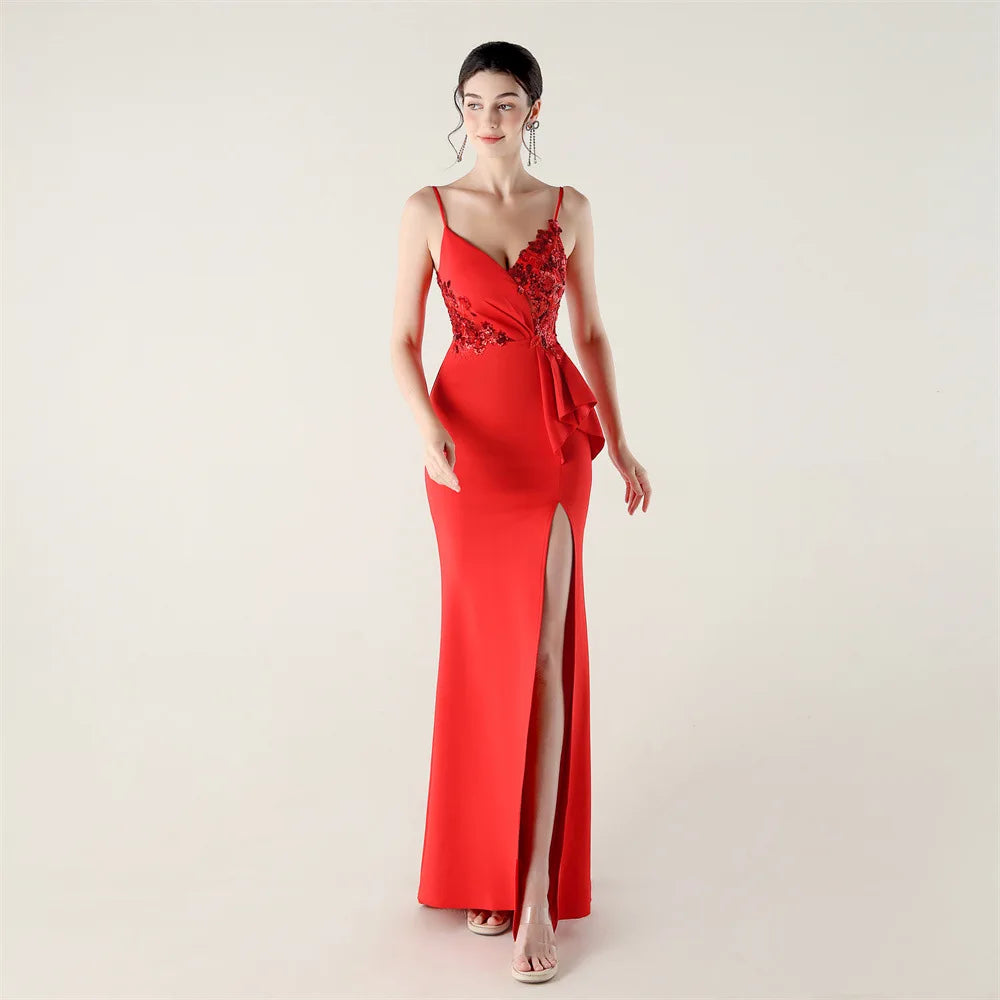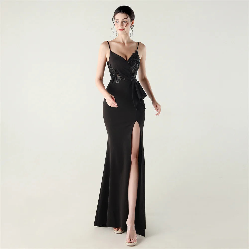 Trend4us Elegant Sequin Appliqué Slit Maxi Evening Dress