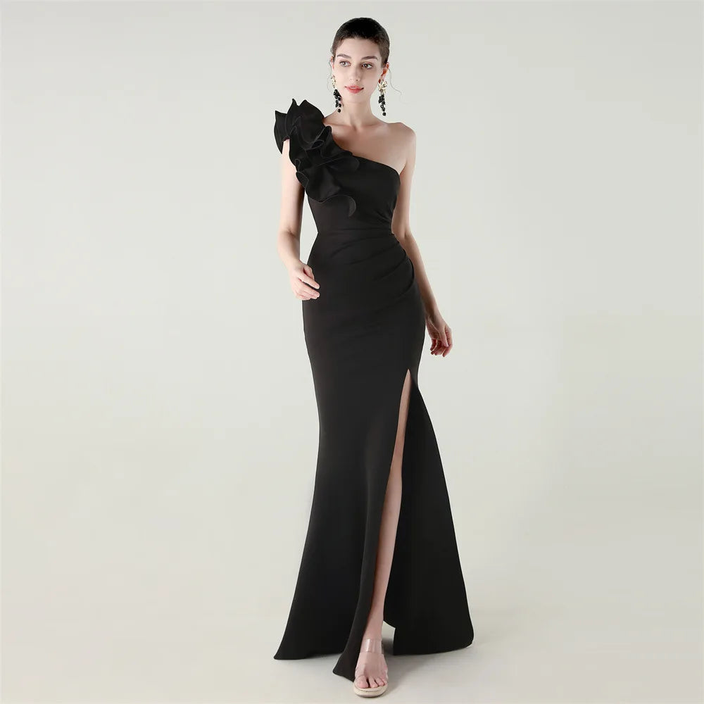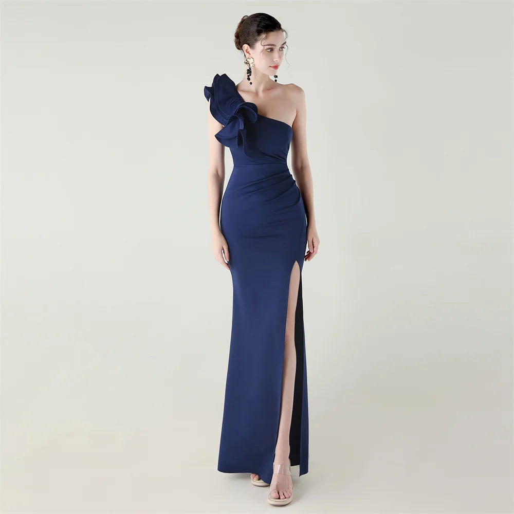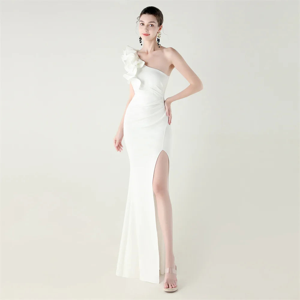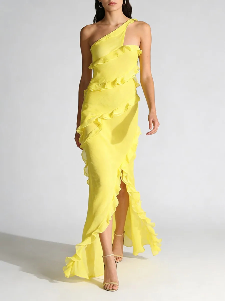 Trend4us Elegant One-Shoulder Ruffle Slit Maxi Evening Gown