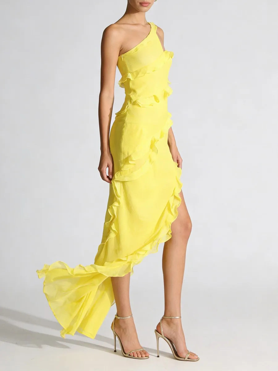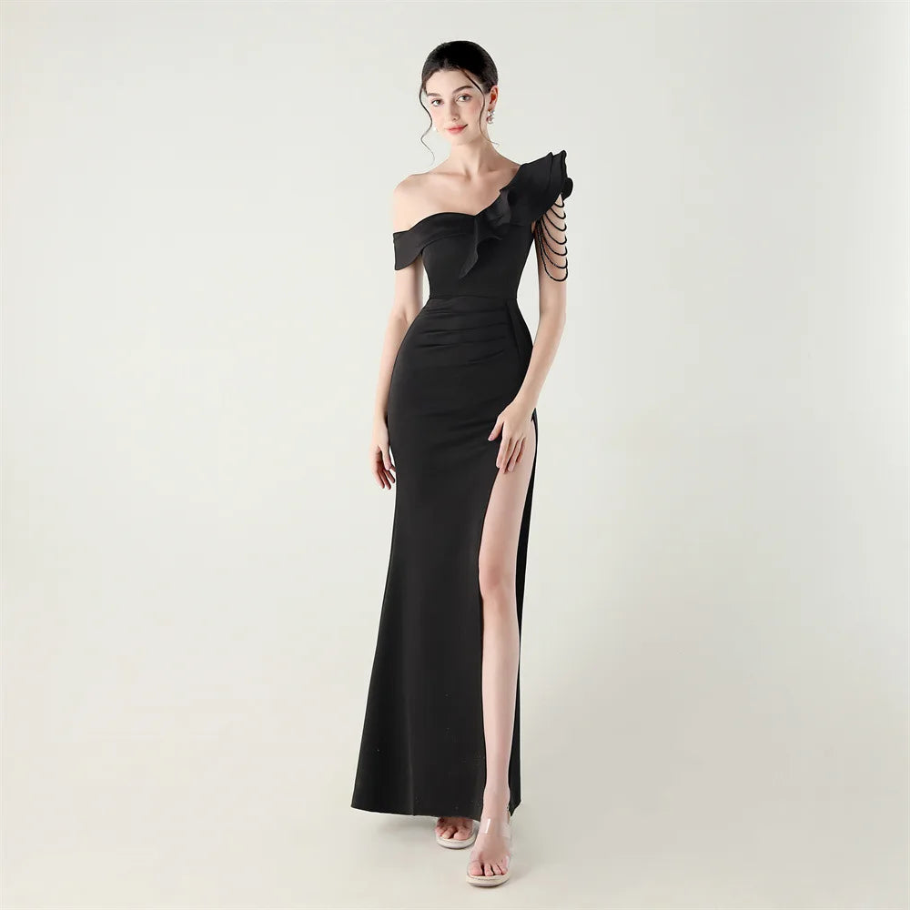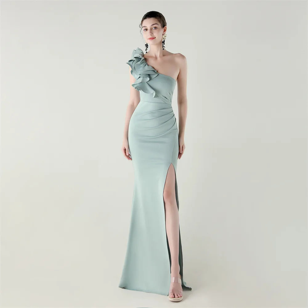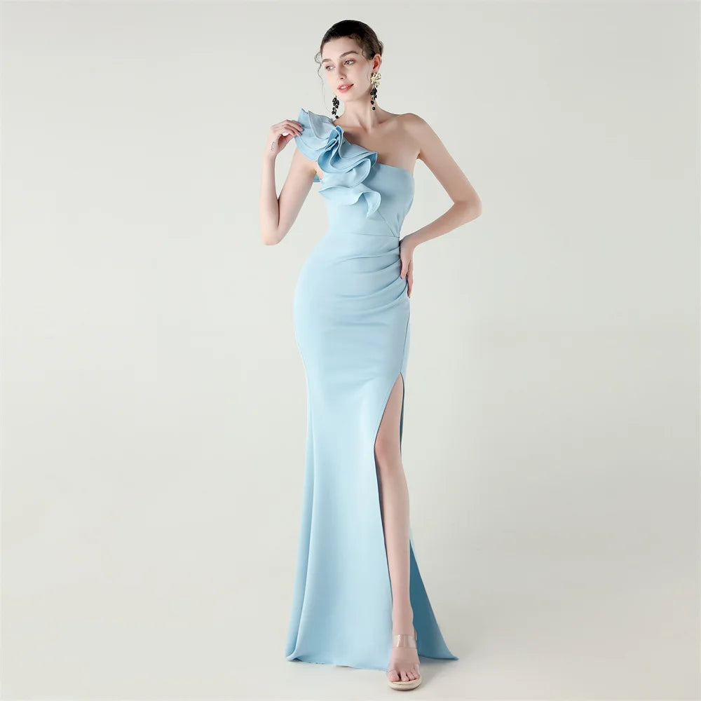Trend4us Elegant One-Shoulder Ruffle Slit Maxi Evening Gown