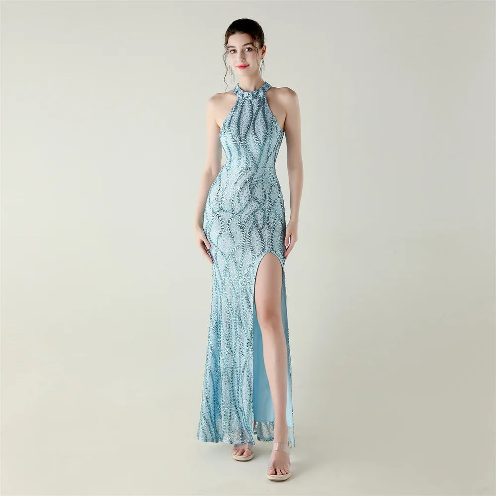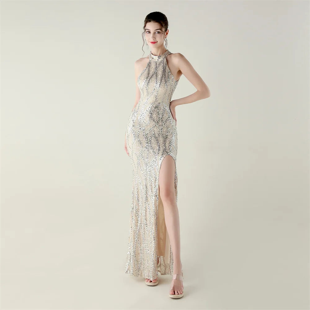 Trend4us Halter Sequin Open-Back Maxi Evening Gown