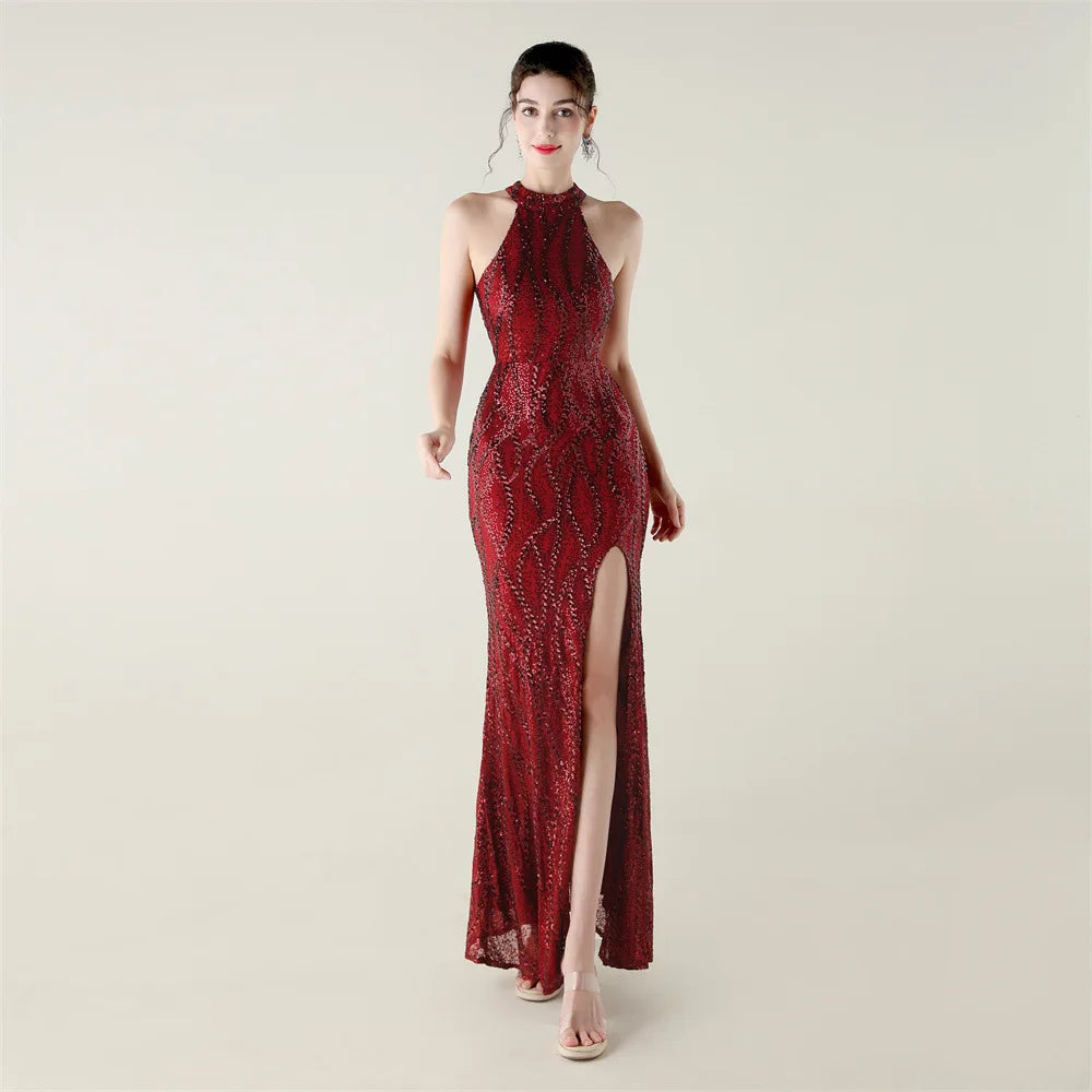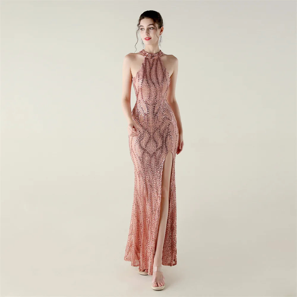 Trend4us Luxe Halter Sequin Open-Back Slit Maxi Evening Gown