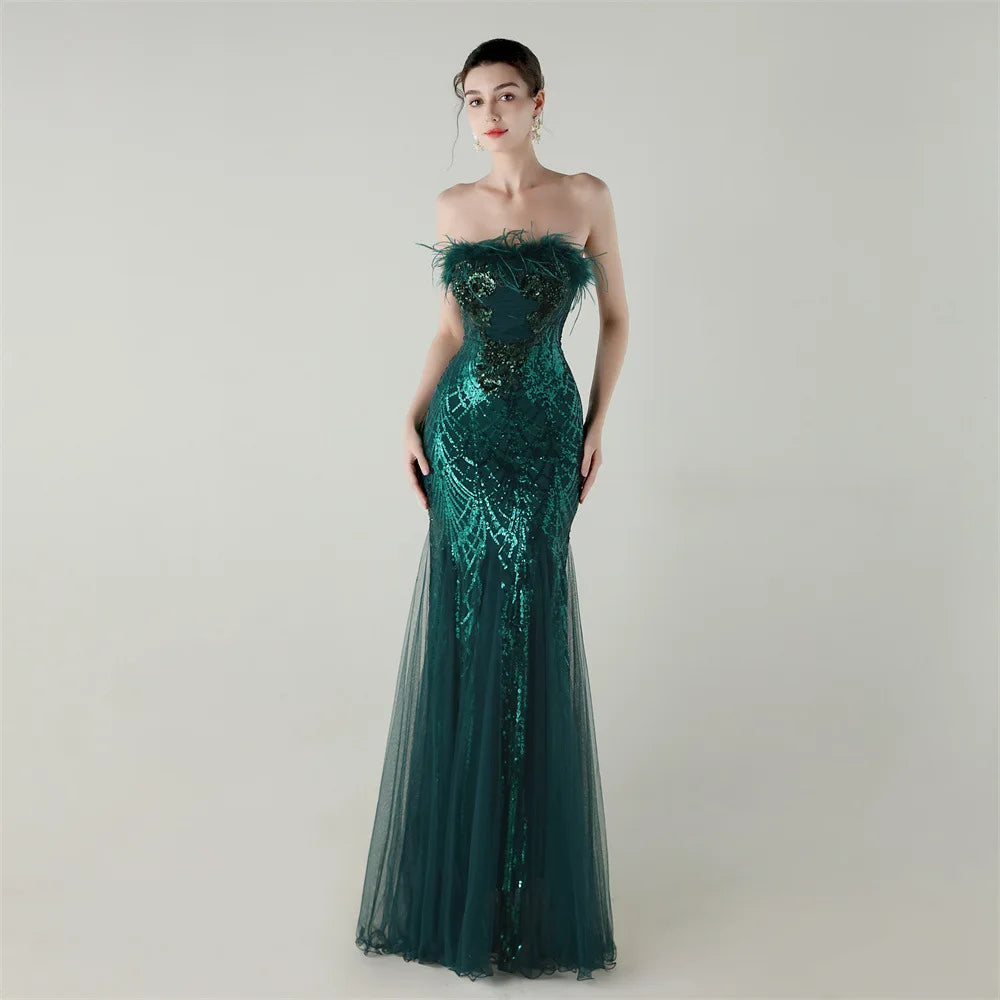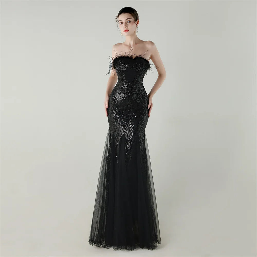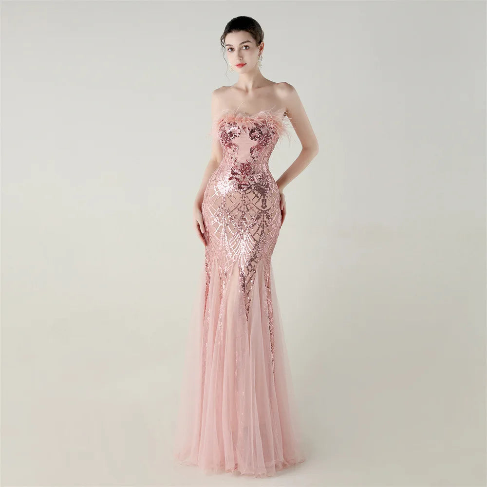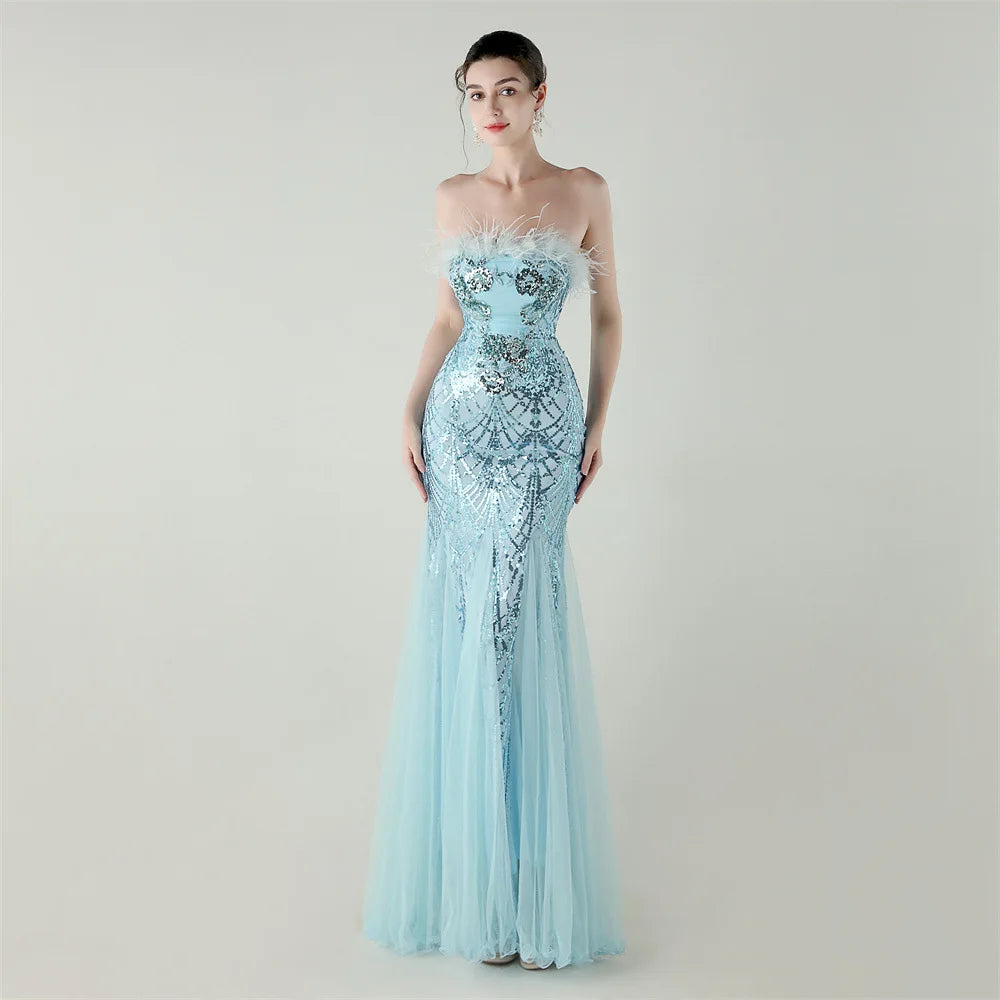Trend4us Luxe Strapless Feather-Trim Sequin Corset Maxi Gown