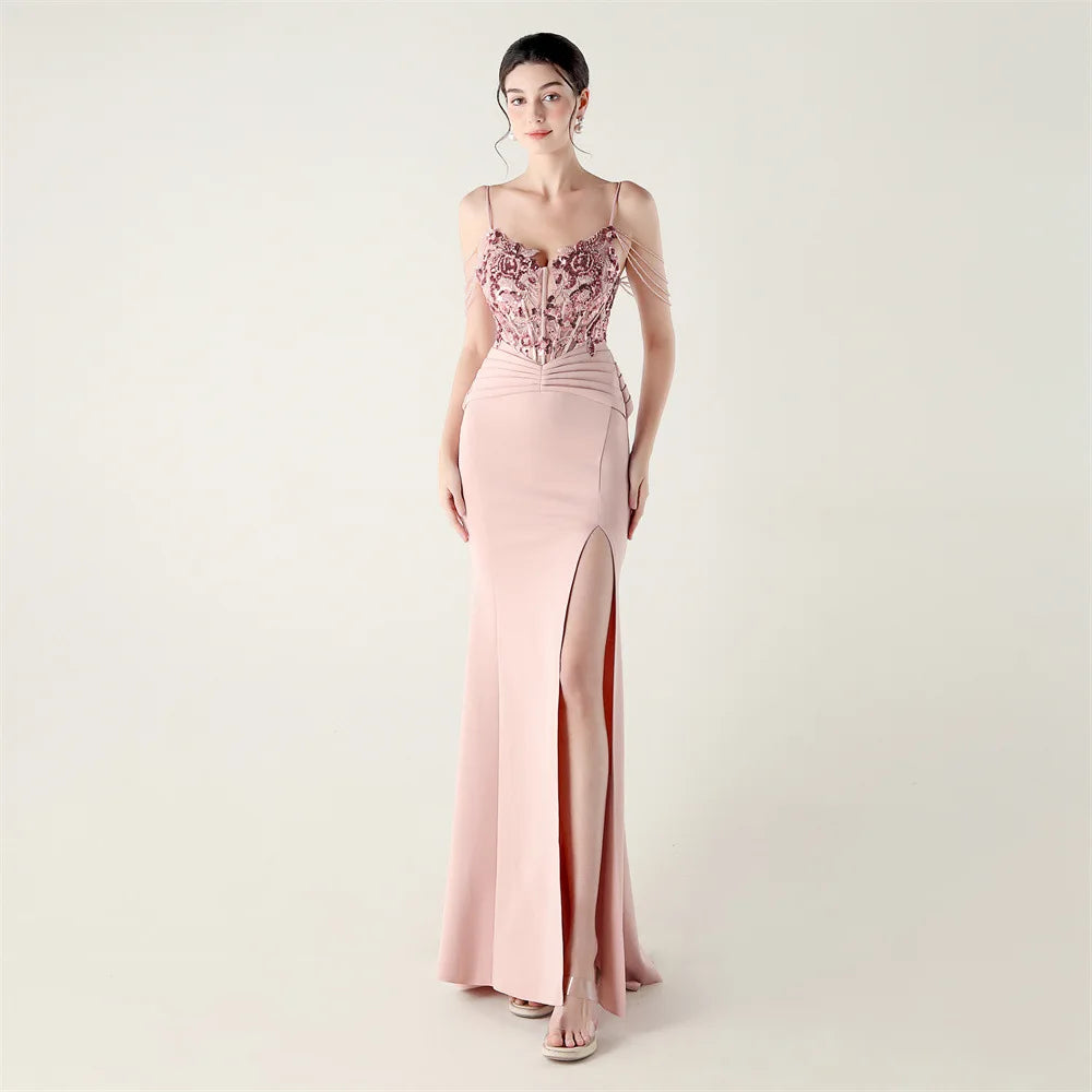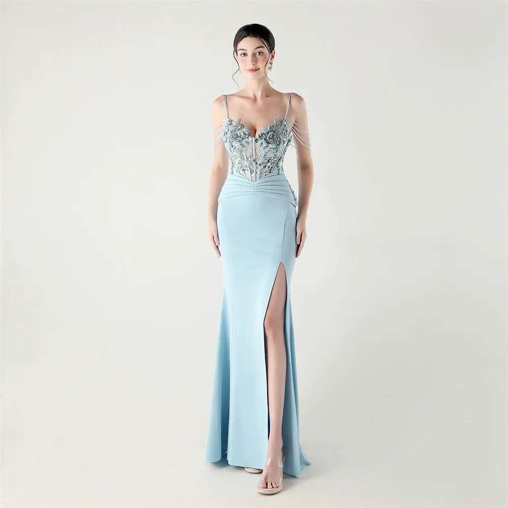 Trend4us Elegant Beaded Corset Slit Maxi Evening Gown