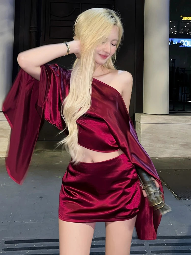 Trend4us Glam Off-Shoulder Satin Draped Two-Piece Set