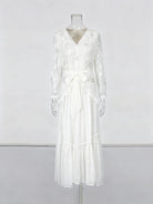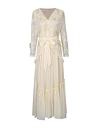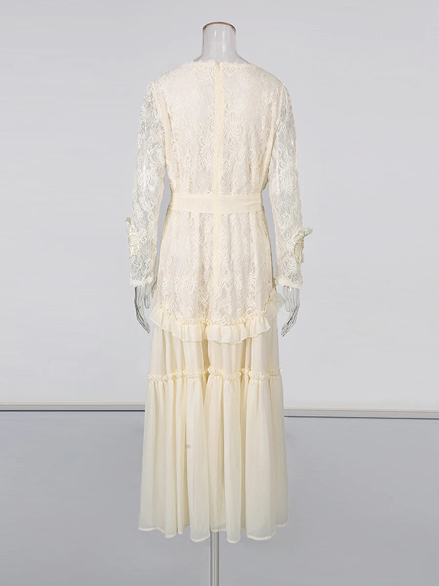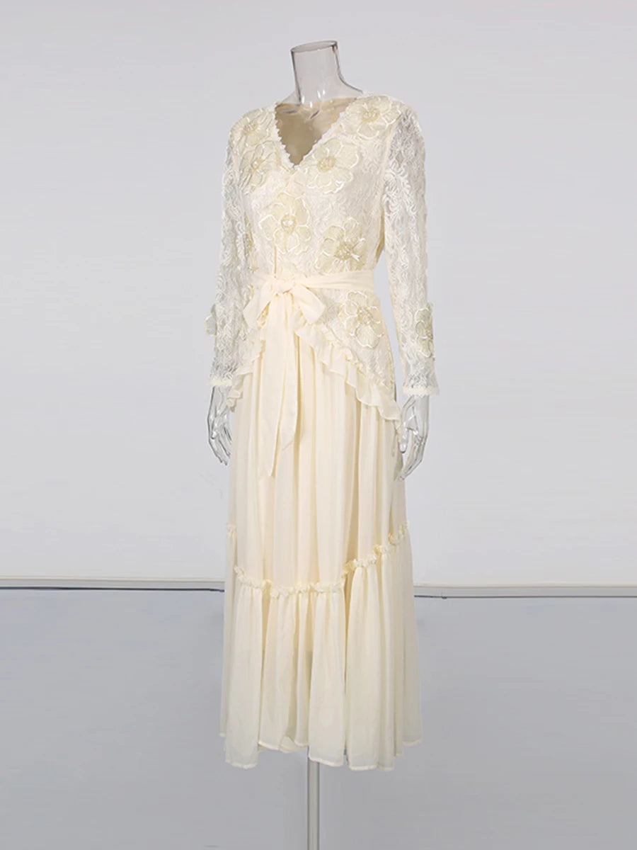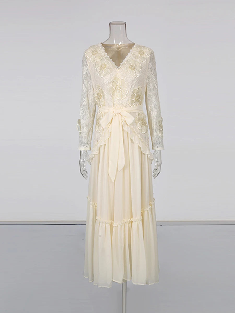 The V-neckline and long lace sleeves add a touch of sophistication, while the self-tie belt defines the waist for a flattering silhouette. Subtle 3D floral appliqués enhance the romantic charm of the design, making it a perfect choice for formal events, weddings, and elegant soirées.