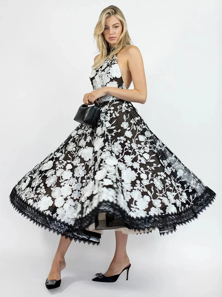 Trend4us Elegant Halter Floral Embroidered Sheer Dress