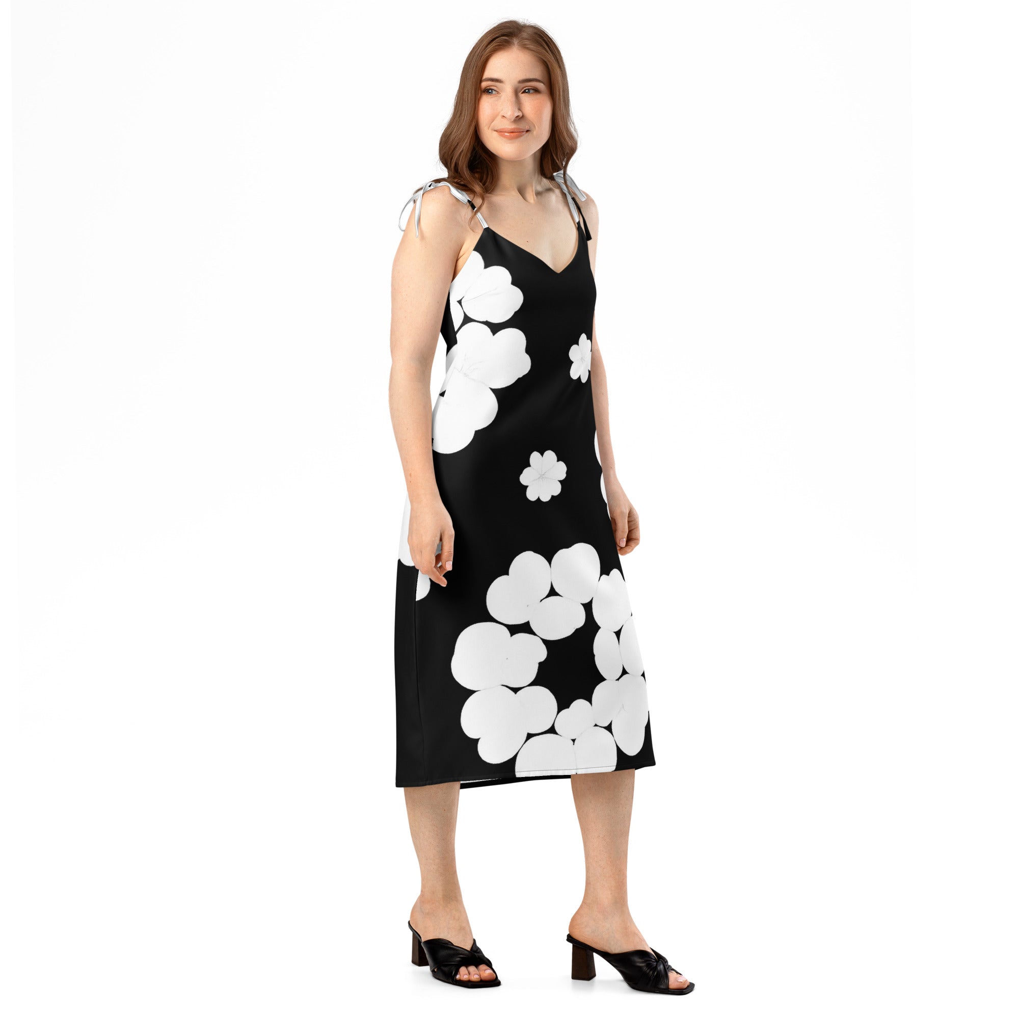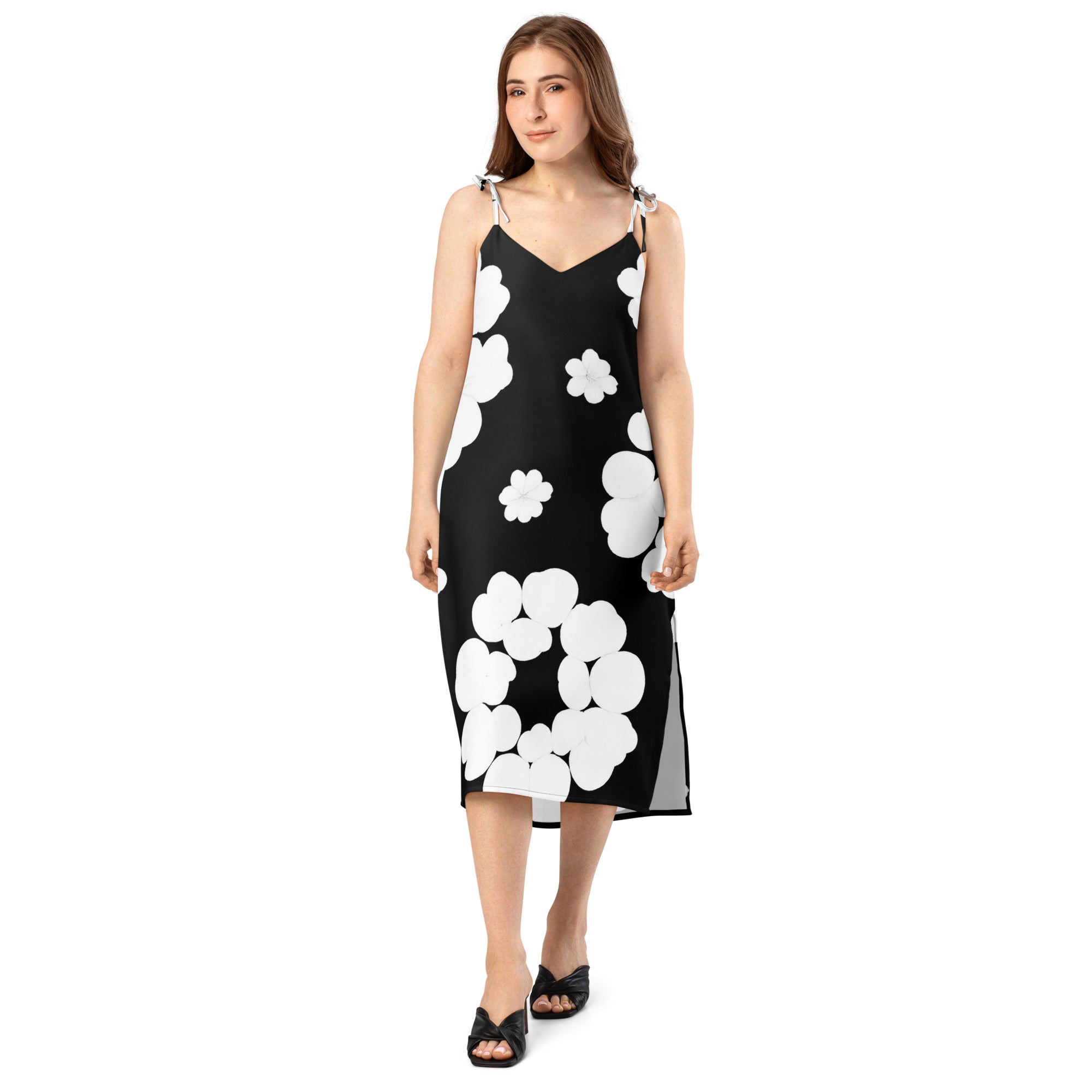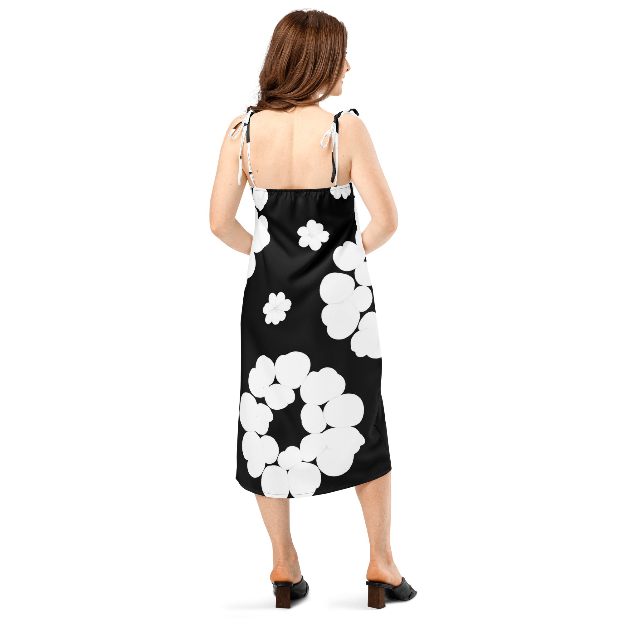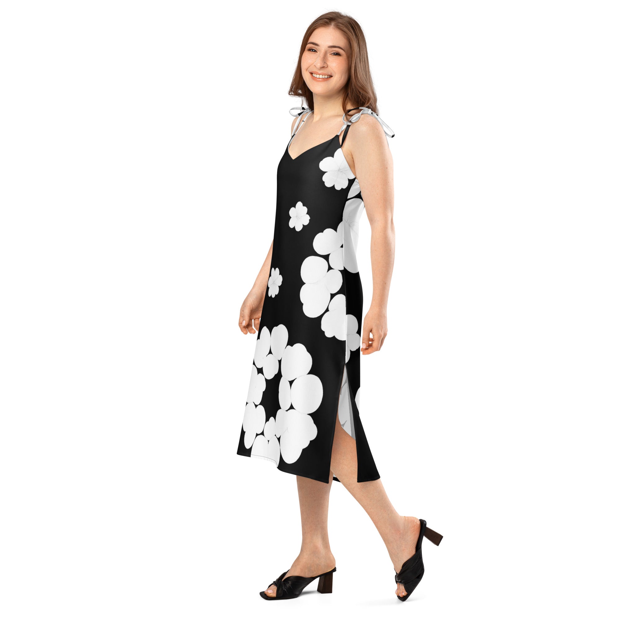 Elevate your wardrobe with the Trend4us Floral Tie-Strap Black Midi Dress. Designed with charming floral prints on a classic black base, this dress features adjustable bow-tie shoulder straps, a sweetheart neckline, and a flowy A-line silhouette. Perfect for summer occasions, brunches, or outdoor events, it blends elegance with everyday comfort in a flattering midi length.