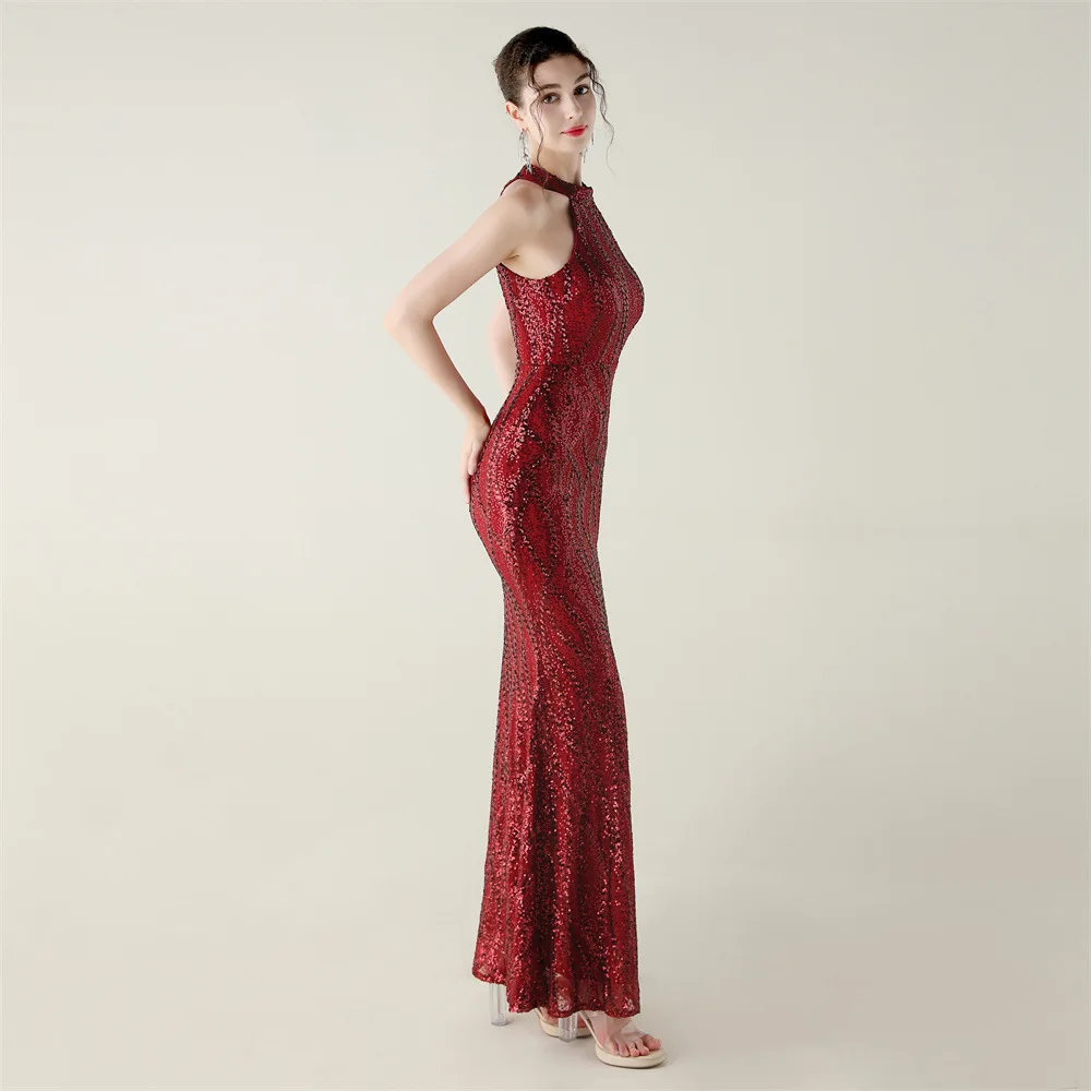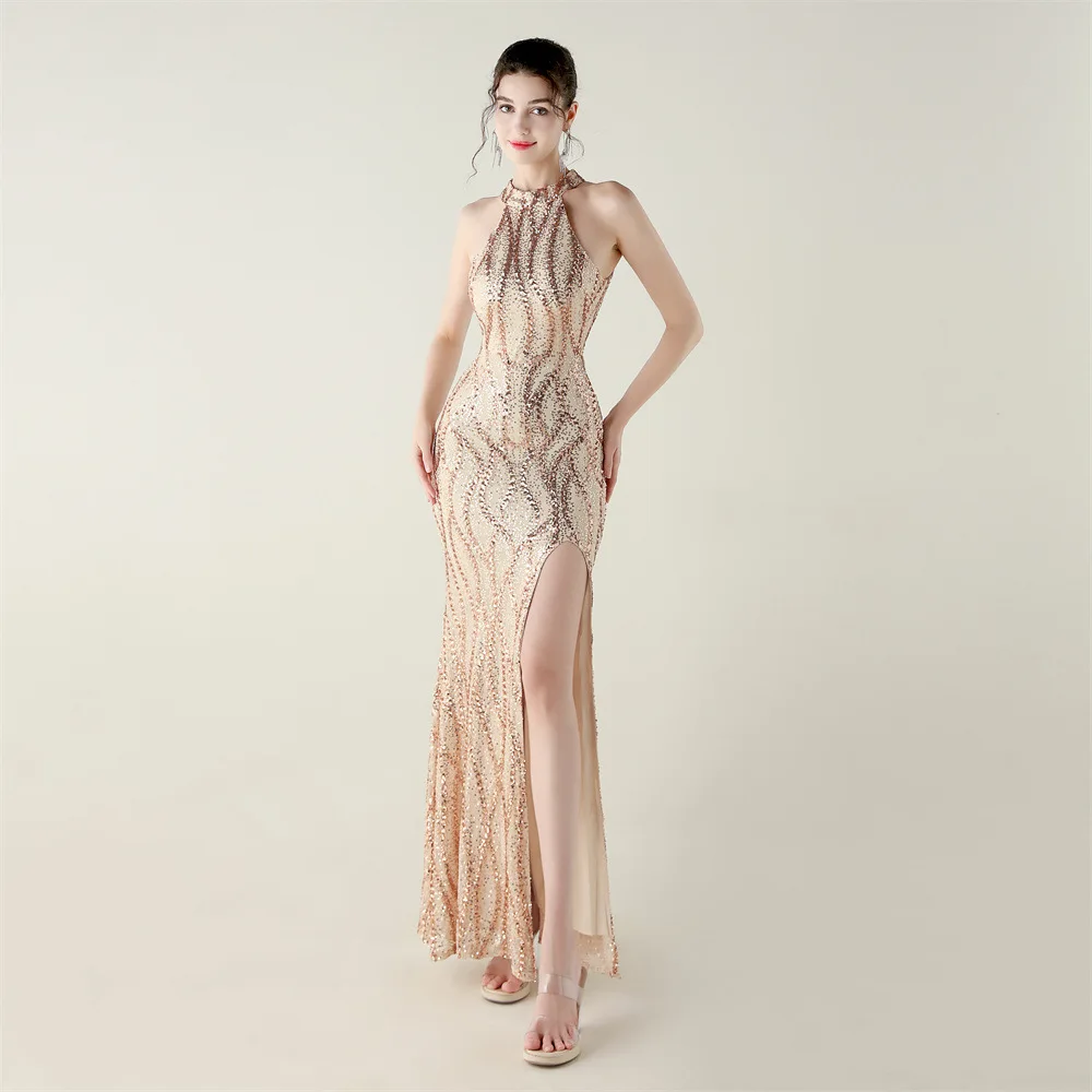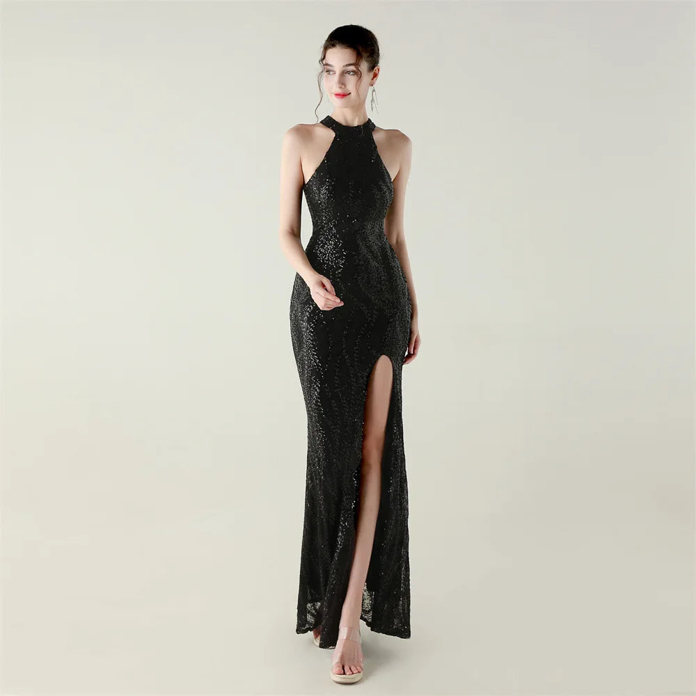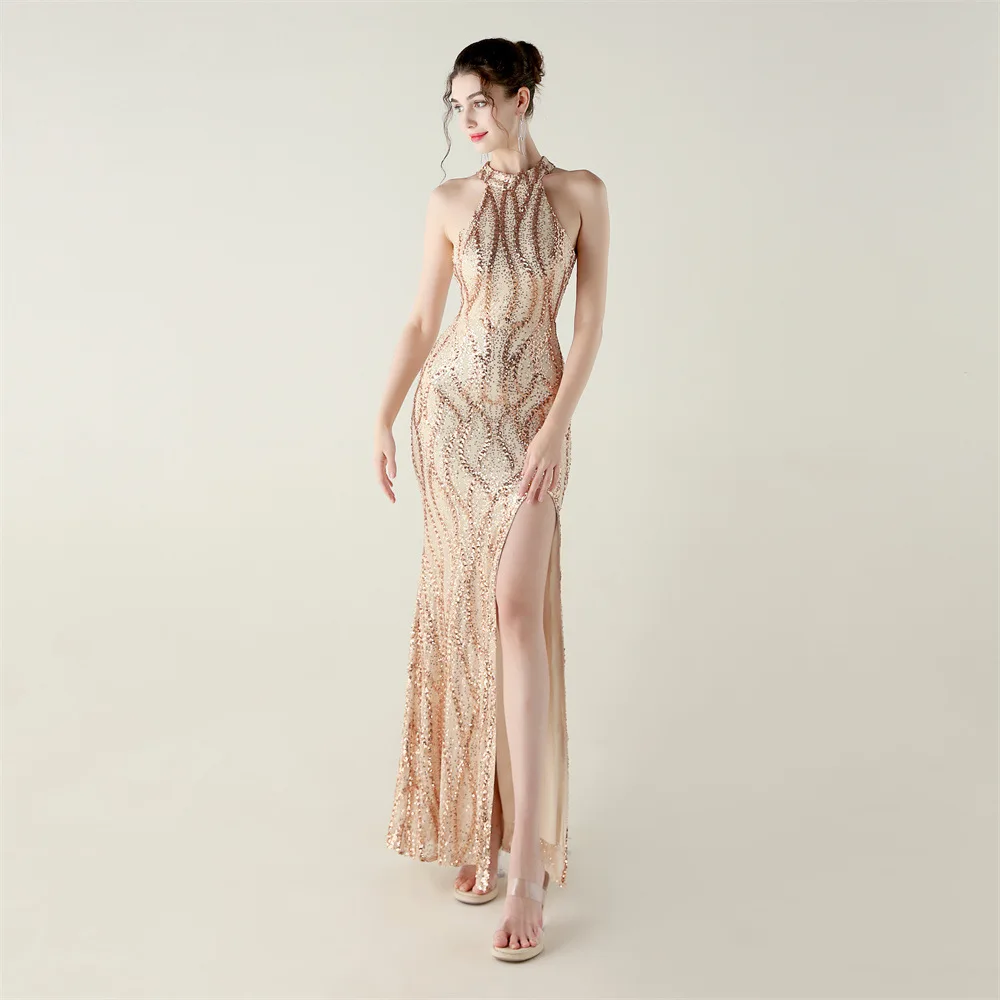 Trend4us Halter Sequin Open-Back Maxi Evening Gown