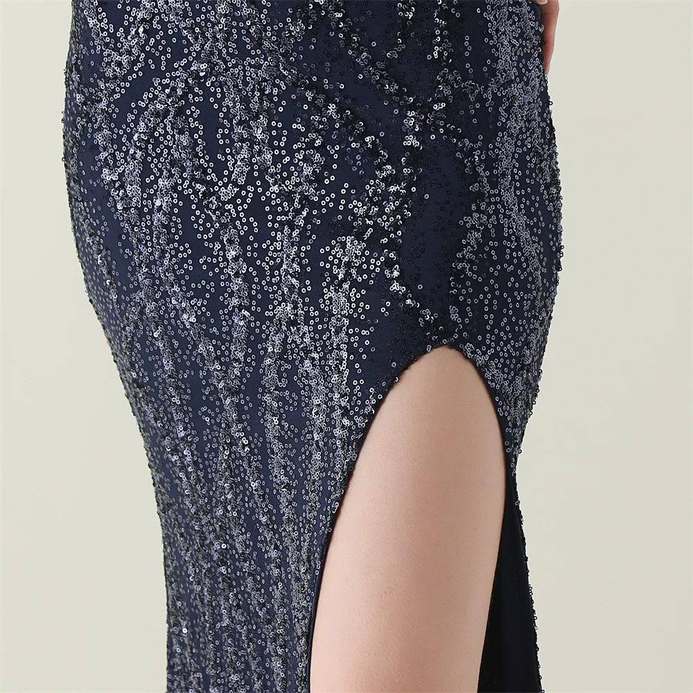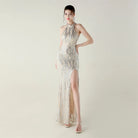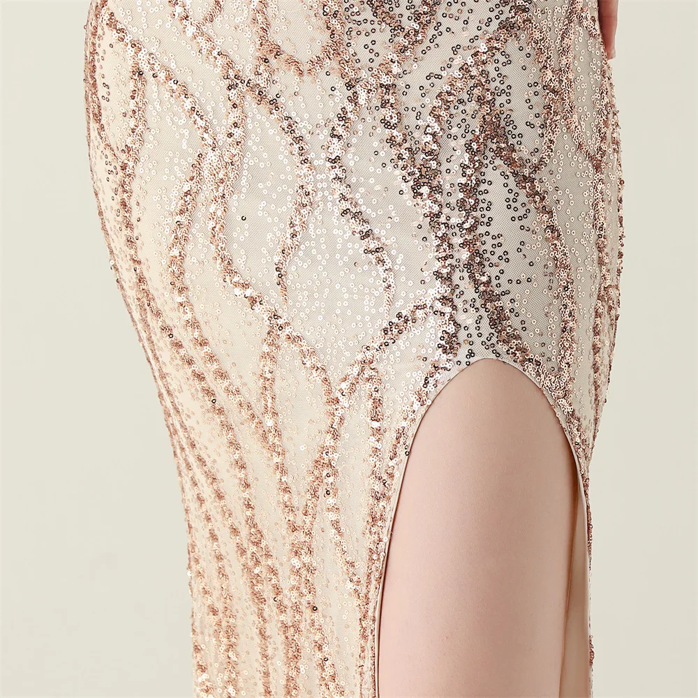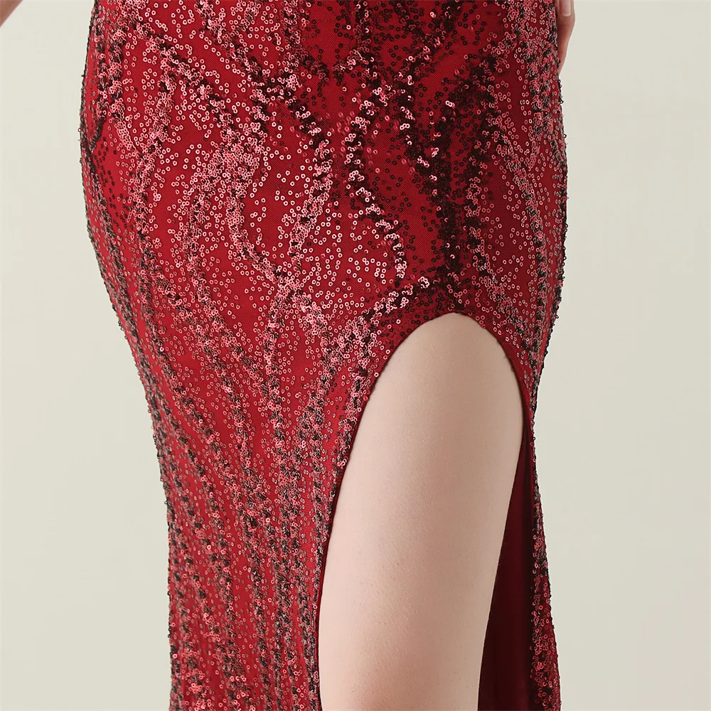 The figure-hugging fit flows effortlessly into a floor-length skirt, finished with a bold thigh-high slit for modern elegance and graceful movement. Perfectly balancing glamour and confidence, this gown is ideal for galas, red-carpet moments, black-tie events, and upscale evening occasions where sophistication is non-negotiable.