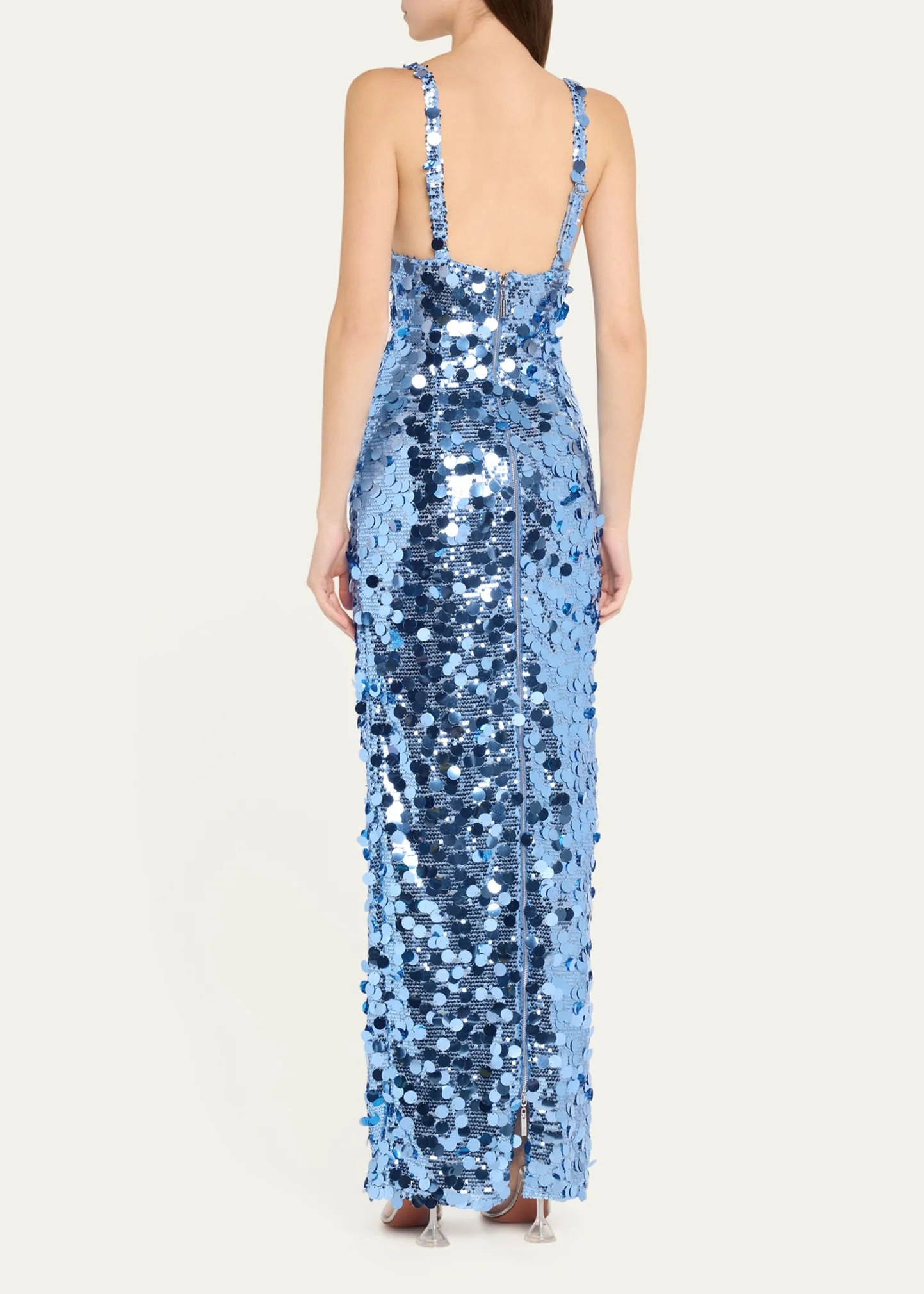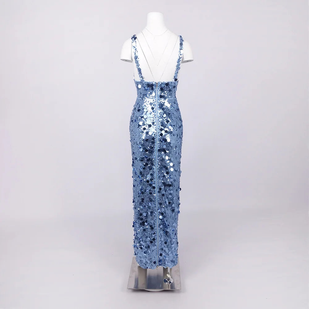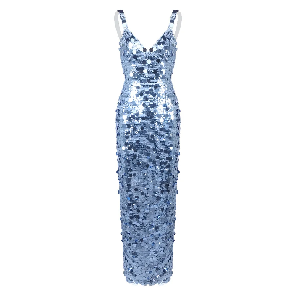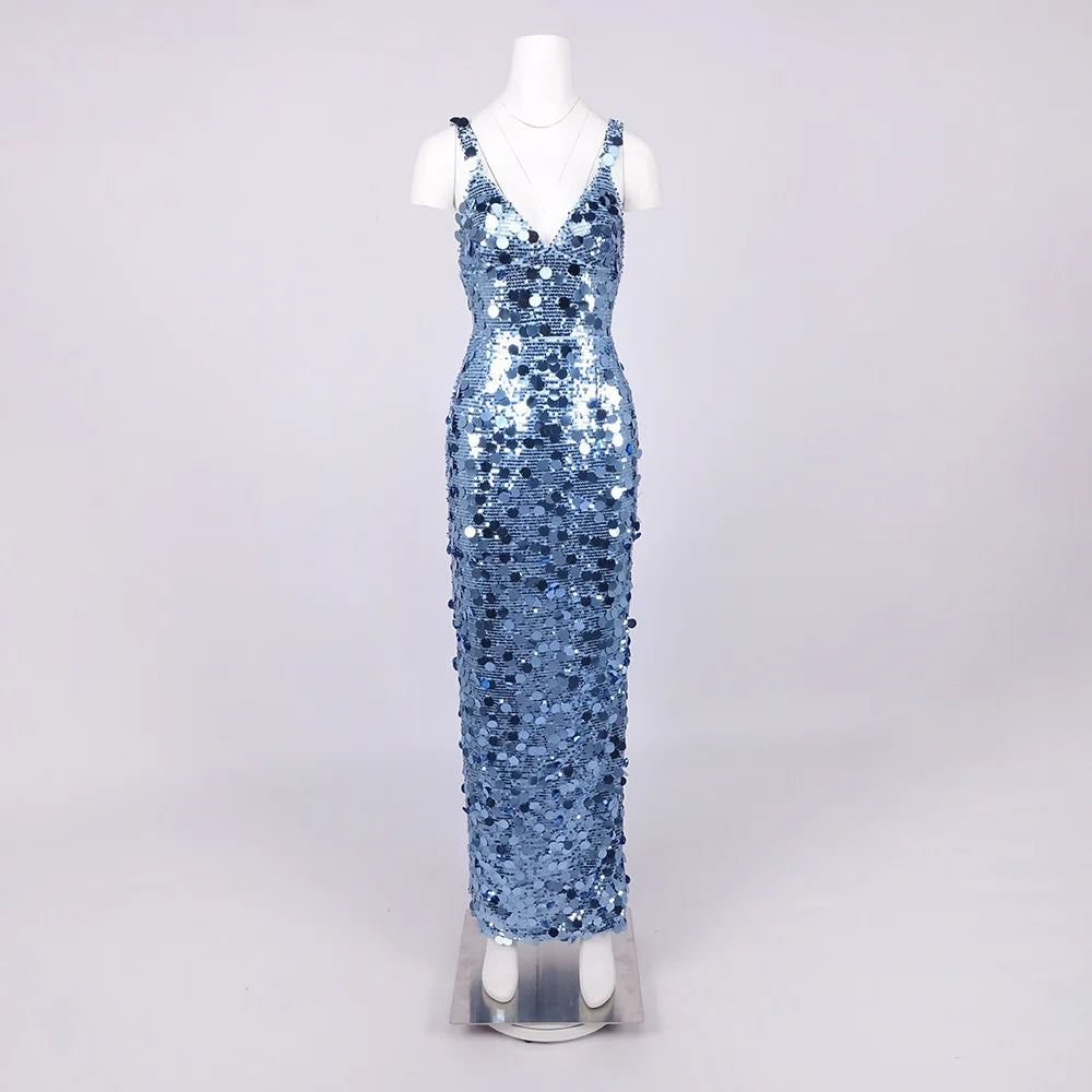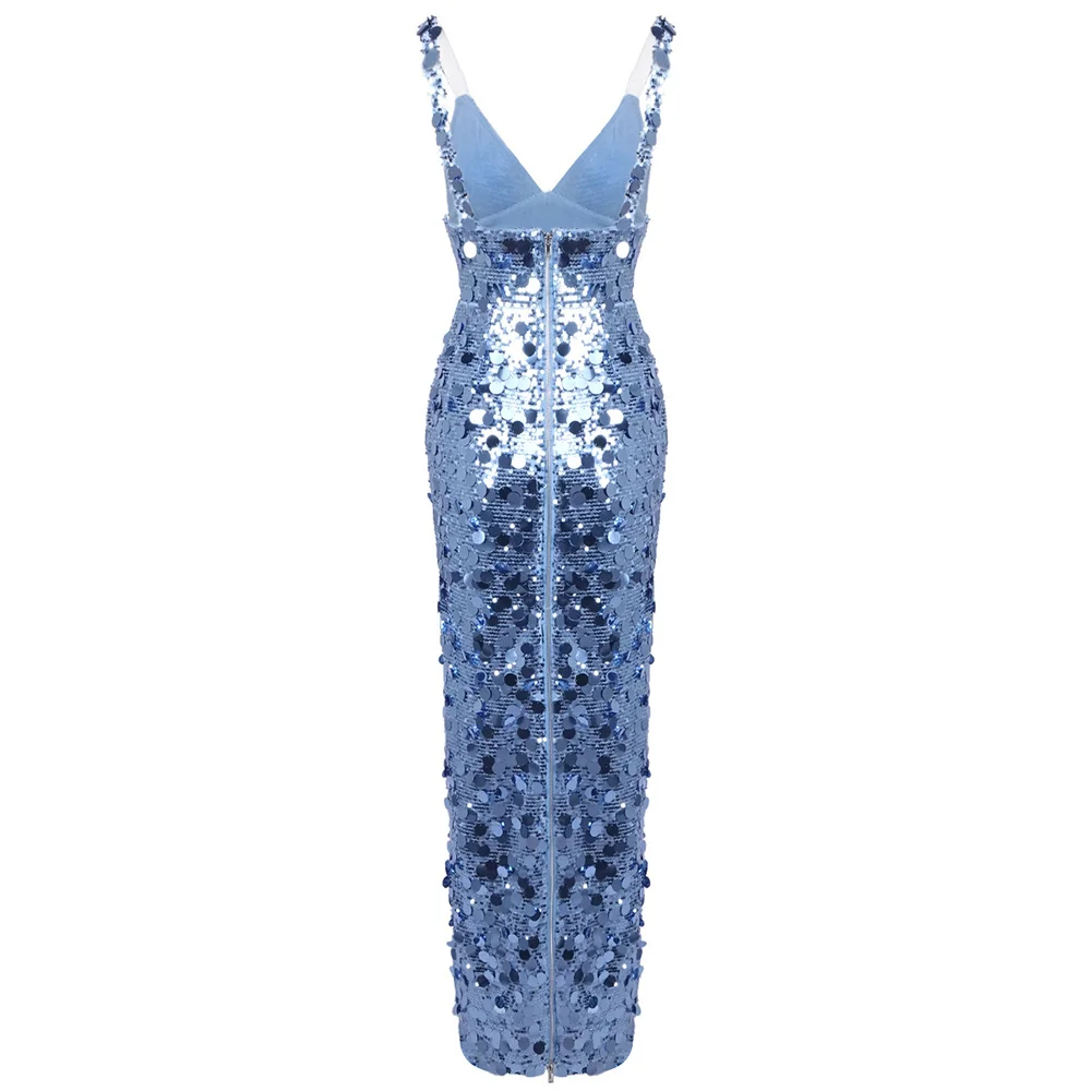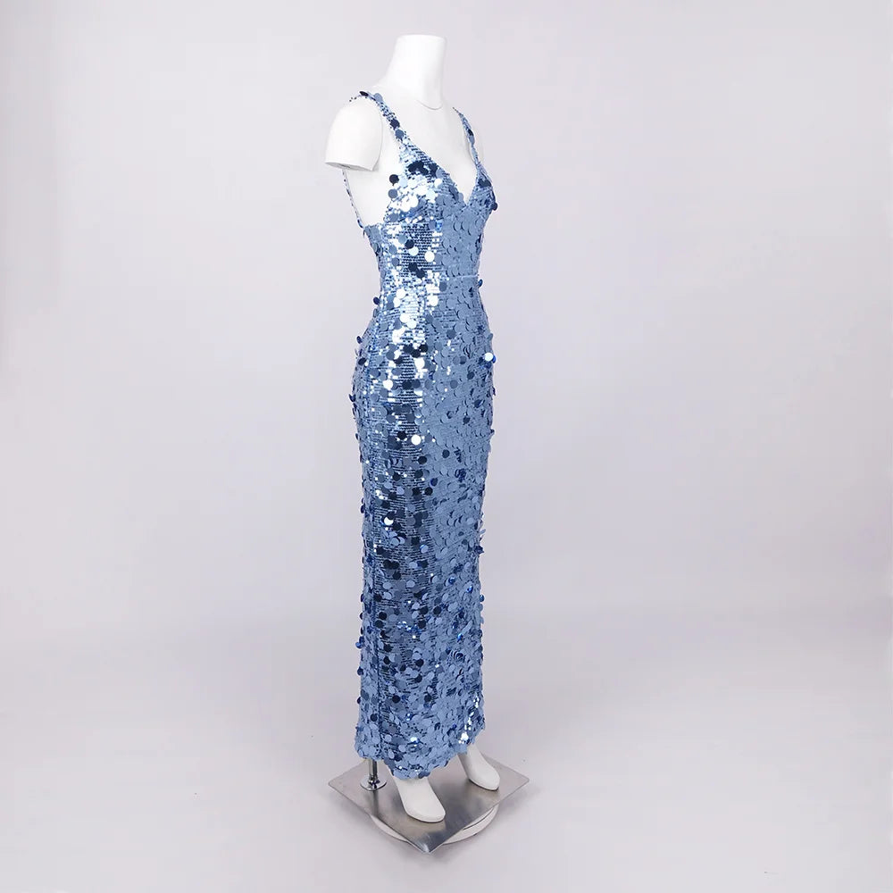 Trend4us Luxe Blue Sequin V-Neck Maxi Evening Gown