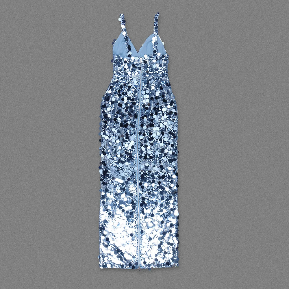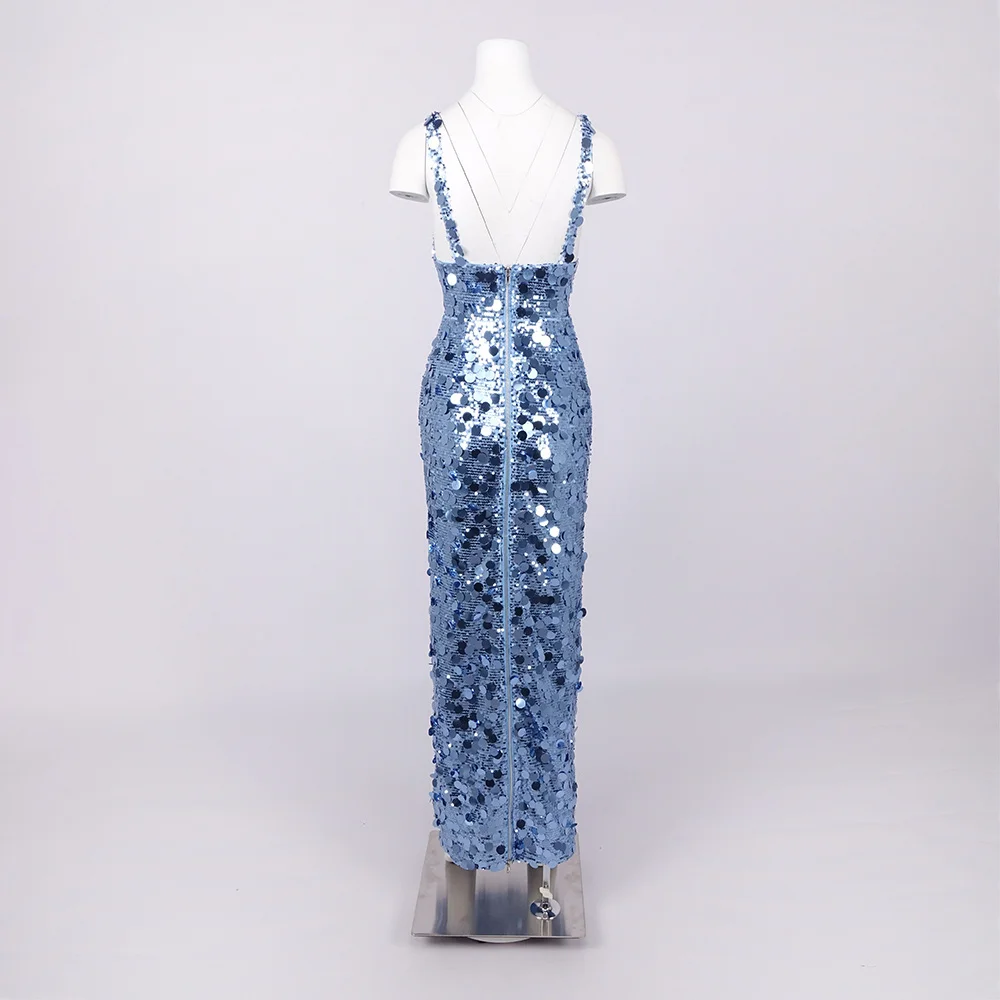 Command the spotlight with the Trend4us Luxe Blue Sequin V-Neck Maxi Evening Gown, a show-stopping creation that radiates sophistication and glamour. Crafted with meticulous attention to detail, this gown is fully adorned with shimmering light-catching sequins that move gracefully with every step, ensuring you sparkle from every angle.