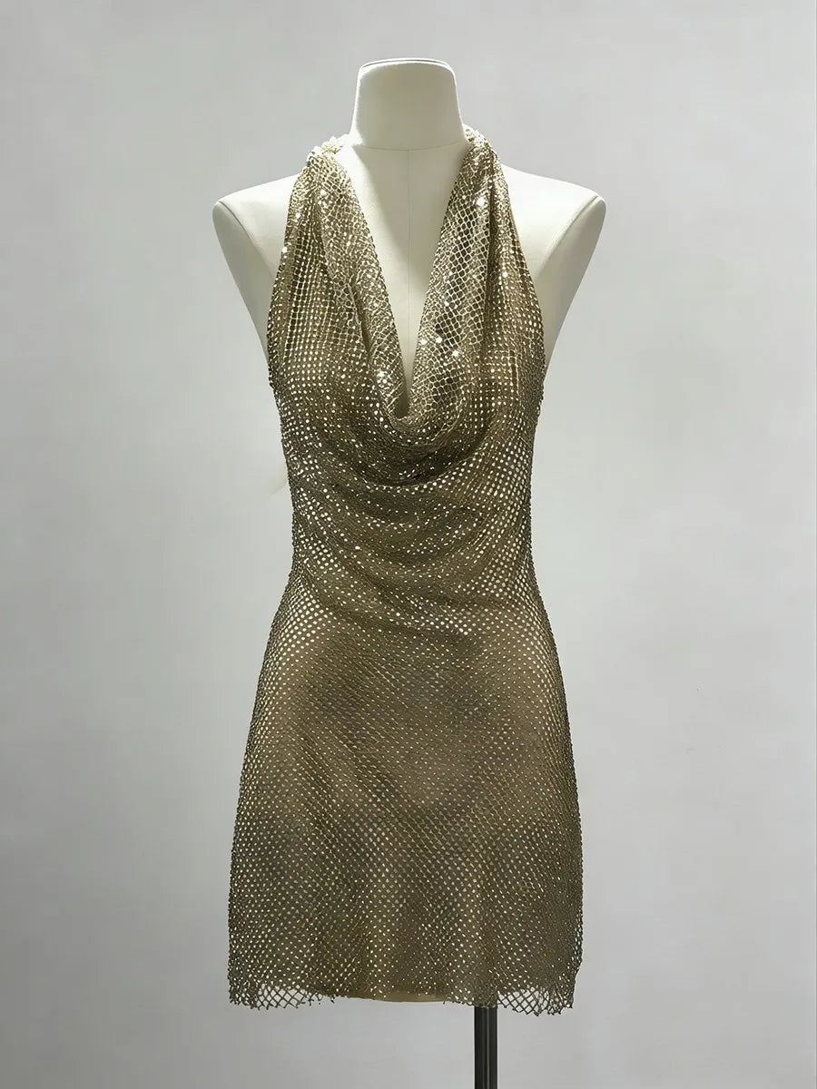 Trend4us Luxe Gold Sequin Draped Halter Mini Dress