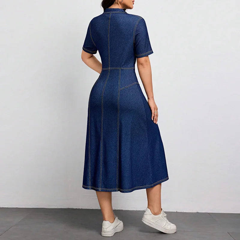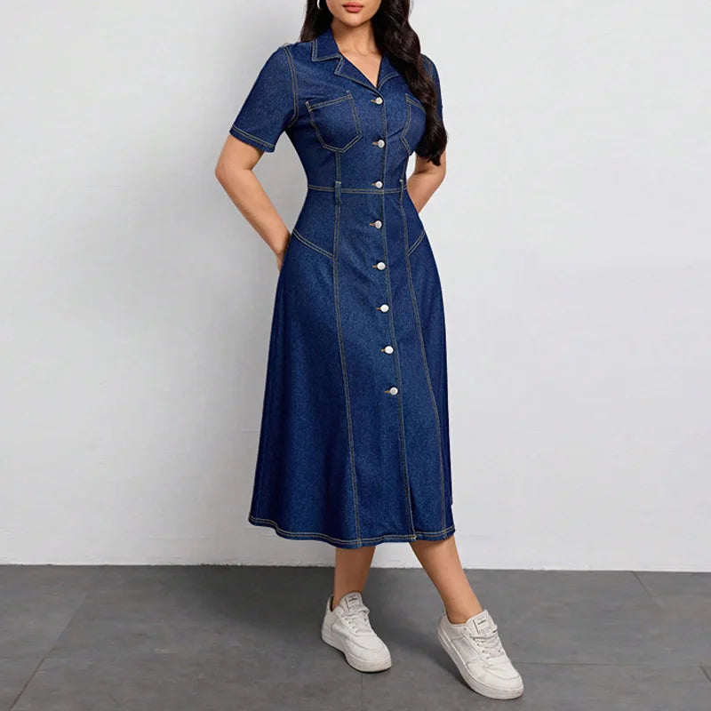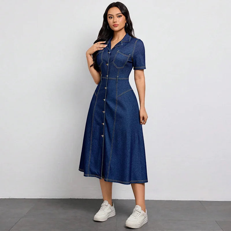 Trend4us Elegant Button-Front Denim Midi Dress