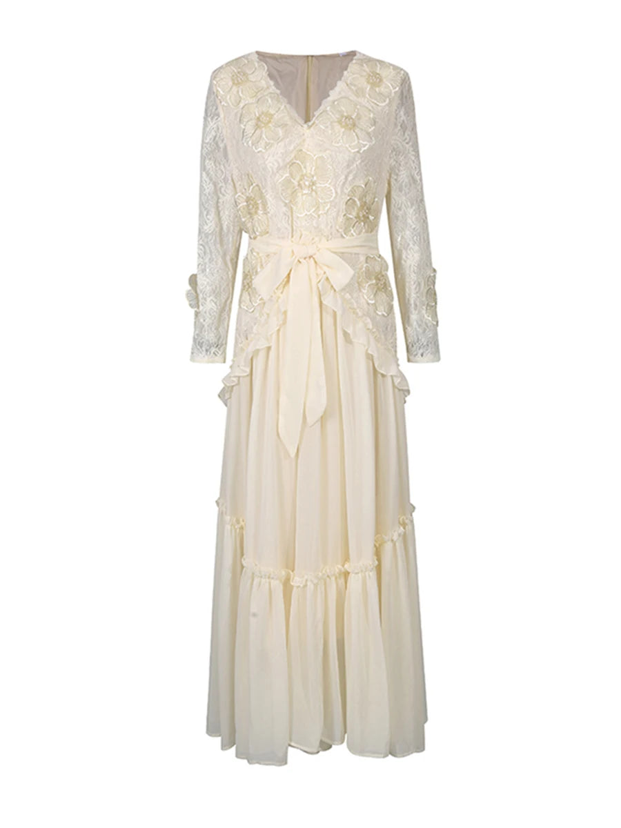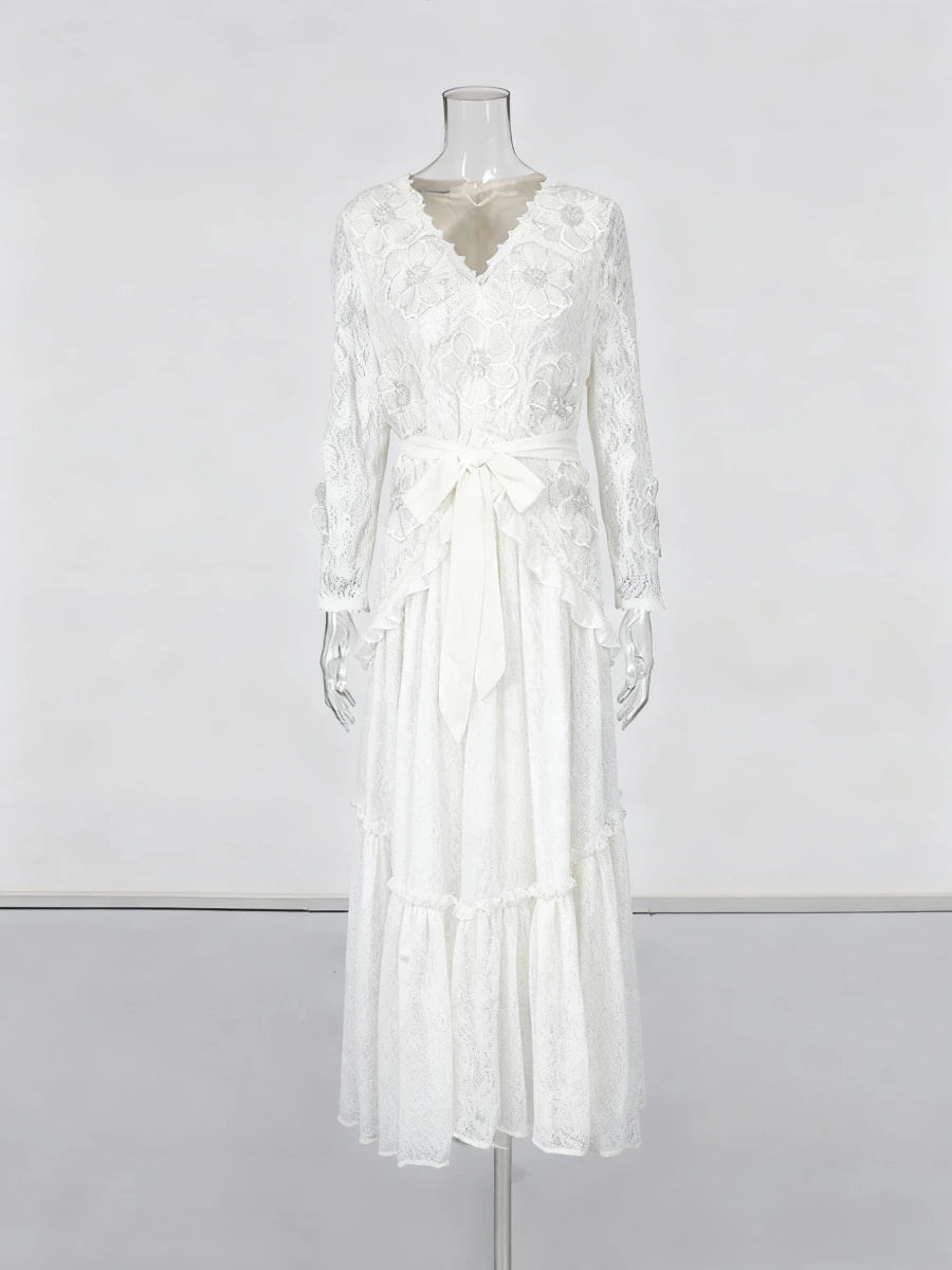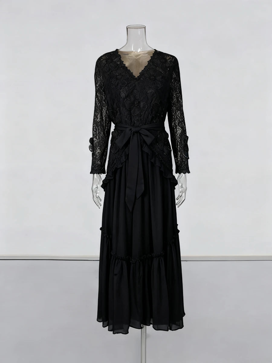 Trend4us Elegant Floral Lace Belted Maxi Dress