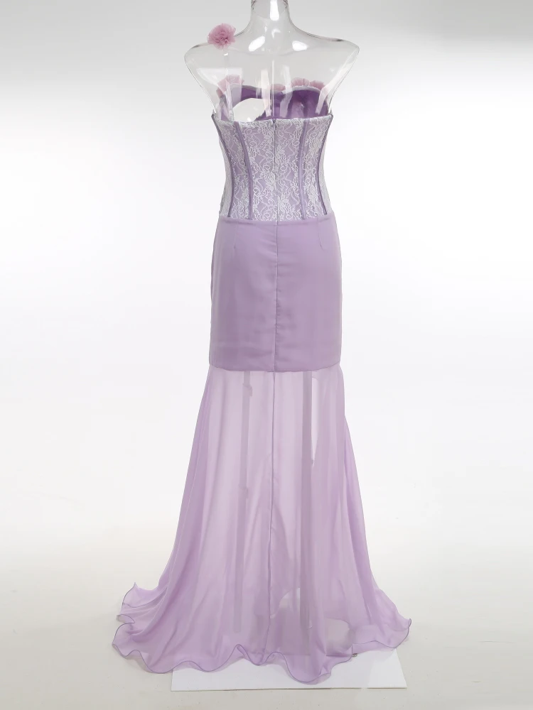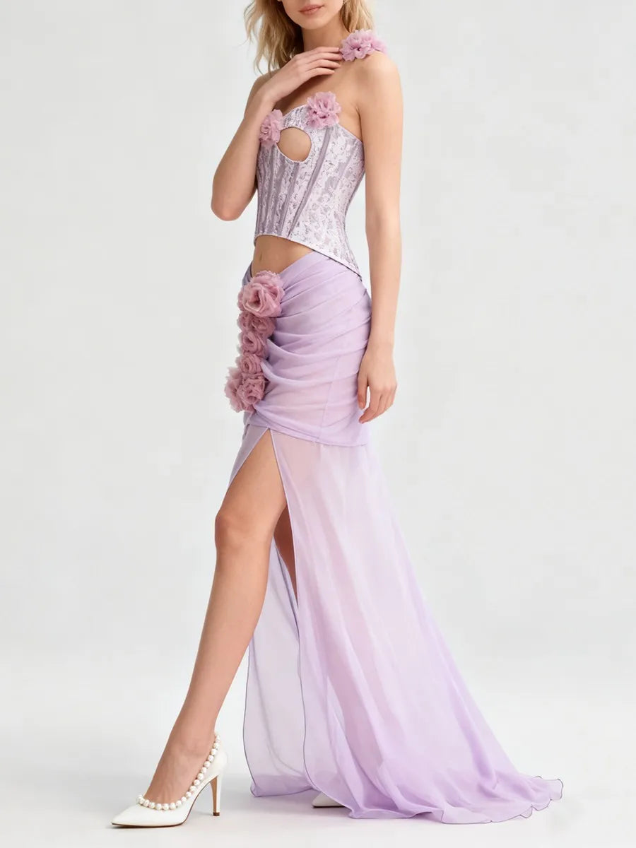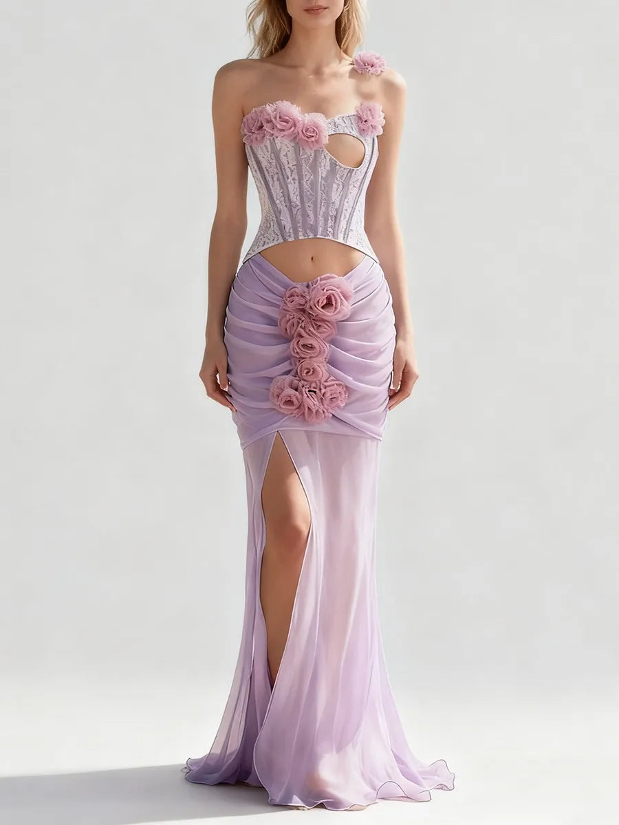 Soft, dimensional rosette appliqués bloom across the neckline and cascading down the skirt, creating a mesmerizing floral path that accentuates curves. The sheer layered maxi skirt drapes into a graceful mermaid silhouette with a thigh-high slit for fluid movement and touch of allure.