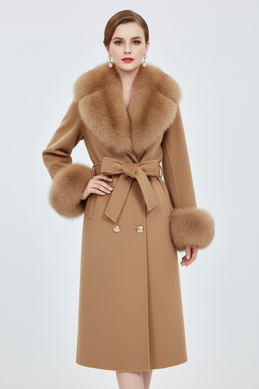 This belted wool coat with faux fur trim brings sophisticated warmth to your winter wardrobe. Crafted from premium cashmere-blend wool with luxurious faux fur collar and cuffs, this long coat combines classic tailoring with modern elegance for the woman who values both style and quality.
