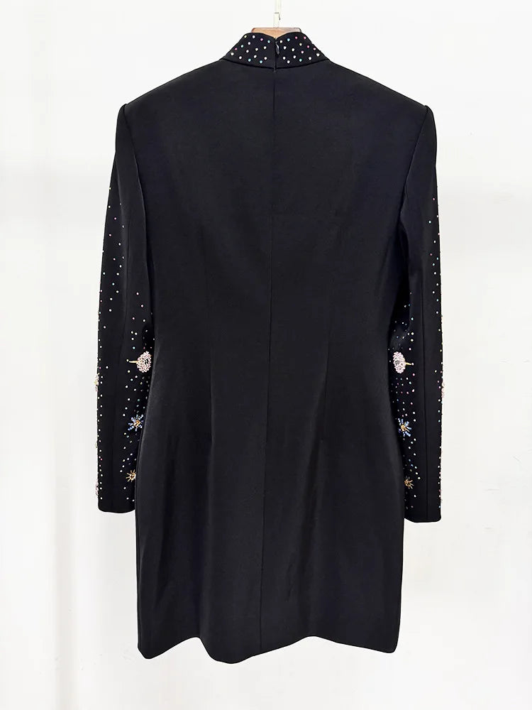 Illuminate every room with the Trend4us Crystal Beaded Long Sleeve Mini Dress, a captivating statement piece crafted for those who embrace glamour with confidence. Designed in a sleek black satin blend, this dress showcases an intricate arrangement of hand-beaded crystals and sequins in radiant starburst patterns — creating a celestial sparkle that catches every glimmer of light.