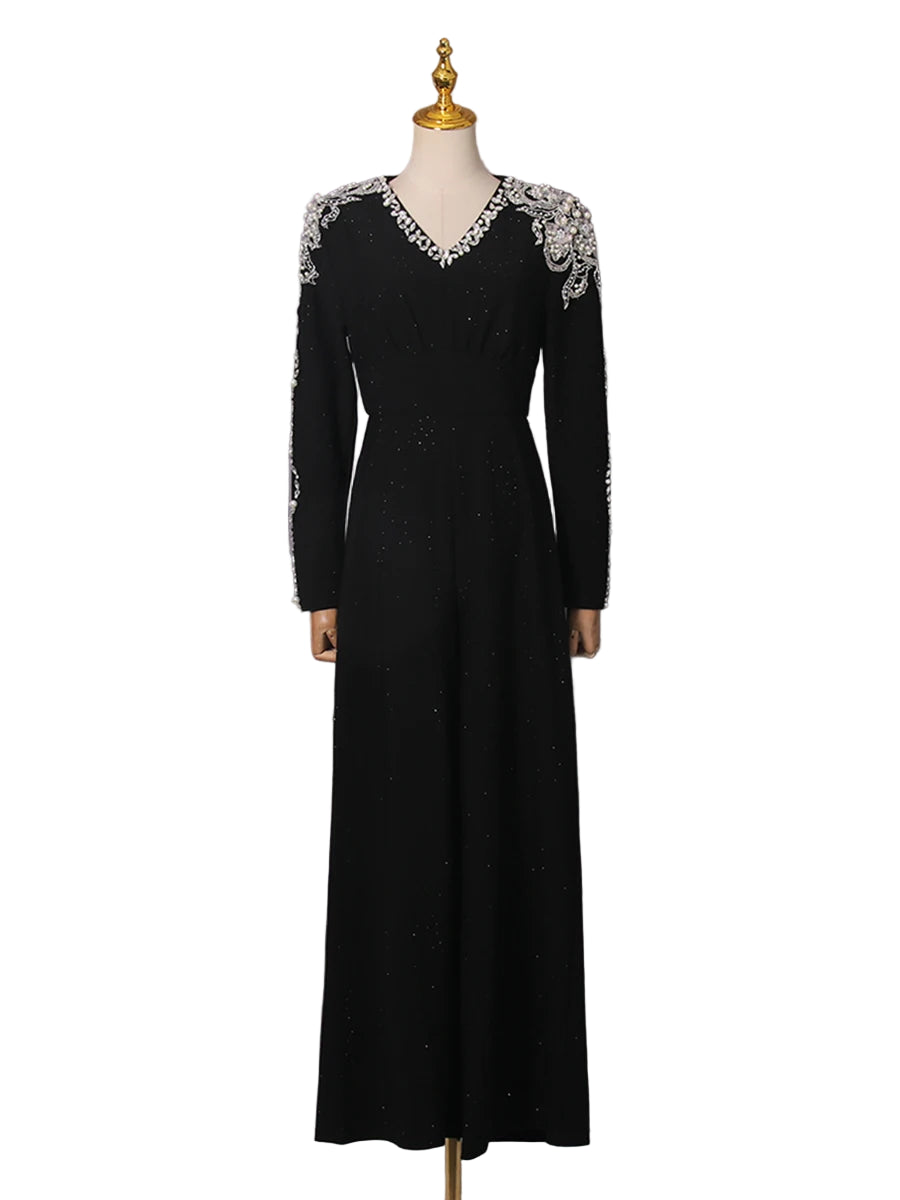 Radiate elegance with the Trend4us Crystal Pearl Embellished Wide-Leg Jumpsuit, a stunning statement piece crafted for evenings that demand sophistication and glamour. This luxurious black jumpsuit features intricate crystal and pearl embellishments cascading across the shoulders and sleeves, creating a dazzling, refined look. The tailored V-neckline and cinched waist flatter the silhouette, while the flowing wide-leg pants offer both grace and comfort. Perfect for galas, evening events, or any occasion where elegance takes center stage.