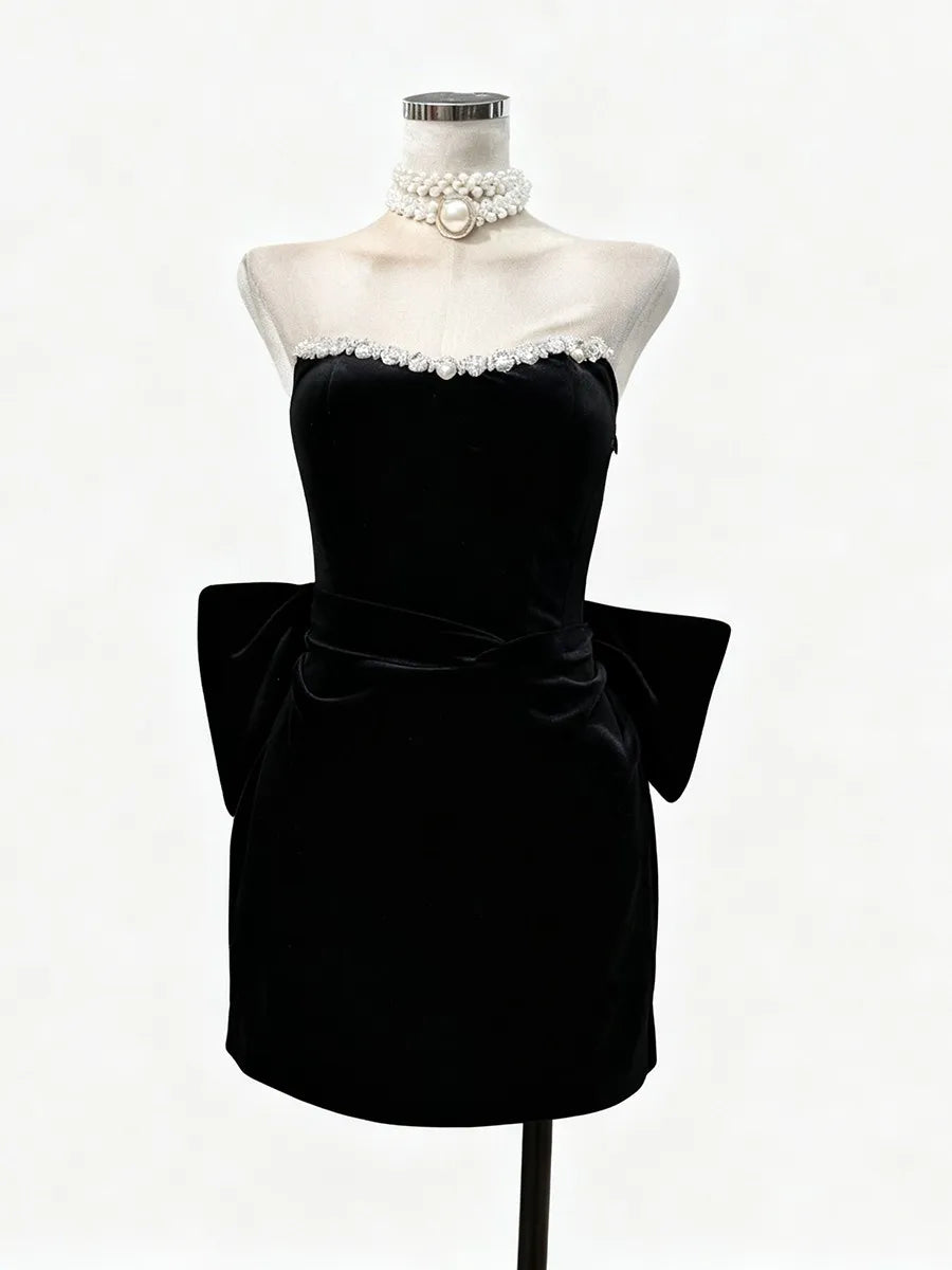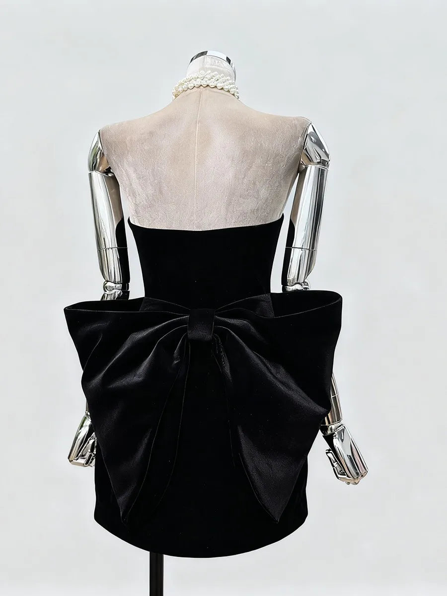 A dramatic statement bow at the back adds couture-level flair, balancing sophistication with playful allure. Whether you're headed to a cocktail event, holiday celebration, or a special night out — this dress guarantees a show-stopping look that leaves a lasting impression.