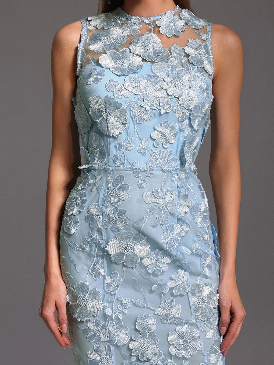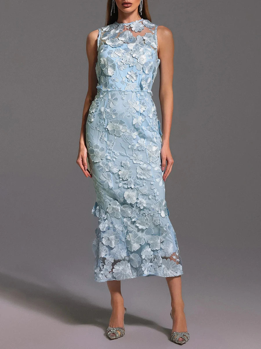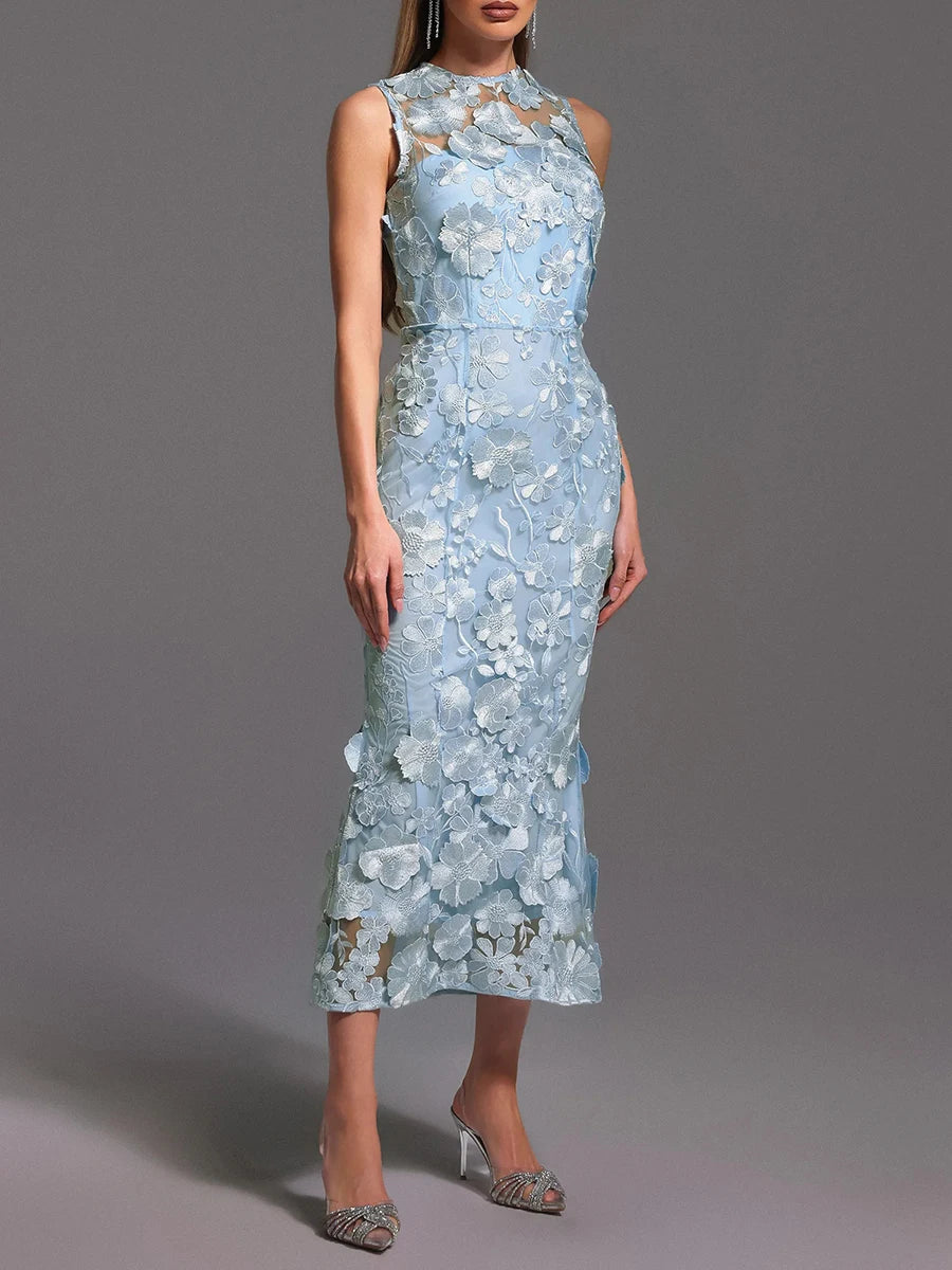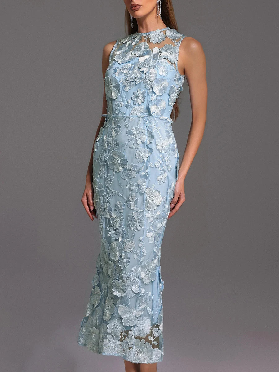 Elevate your elegance with the Trend4us Elegant 3D Floral Lace Midi Dress, a captivating blend of romance and refinement. Crafted from sheer mesh and fully lined through the bodice and skirt, this sleeveless design features exquisite 3D floral embroidery that adds rich texture and dimension. The high illusion neckline and body-contouring fit create a graceful silhouette, perfect for weddings, upscale events, or formal evening affairs.