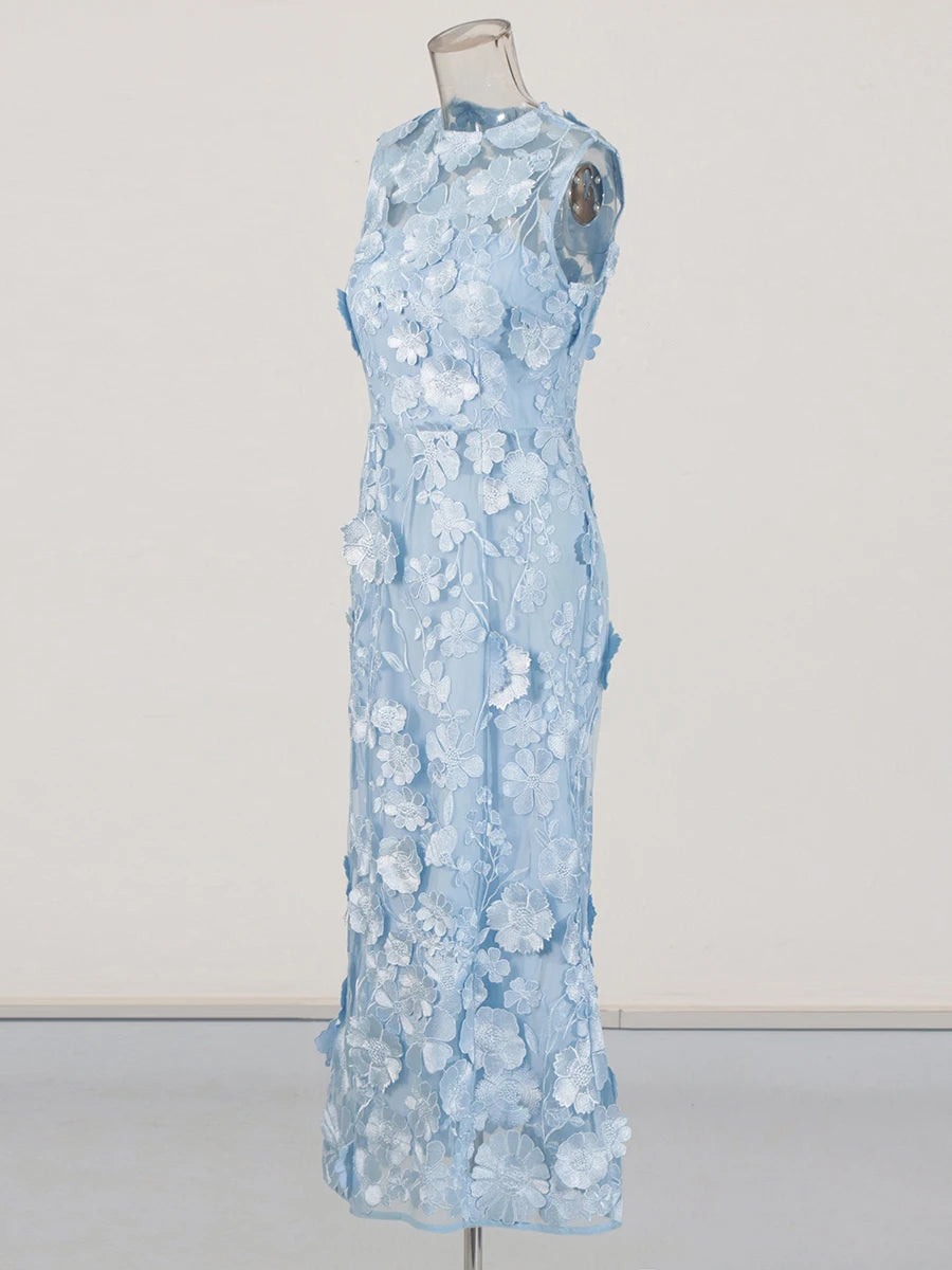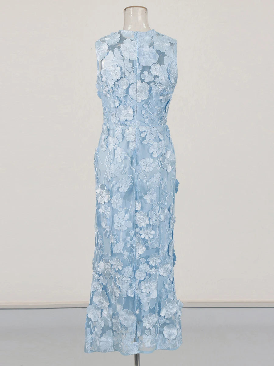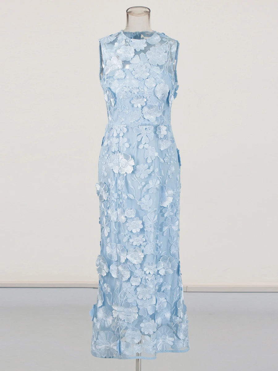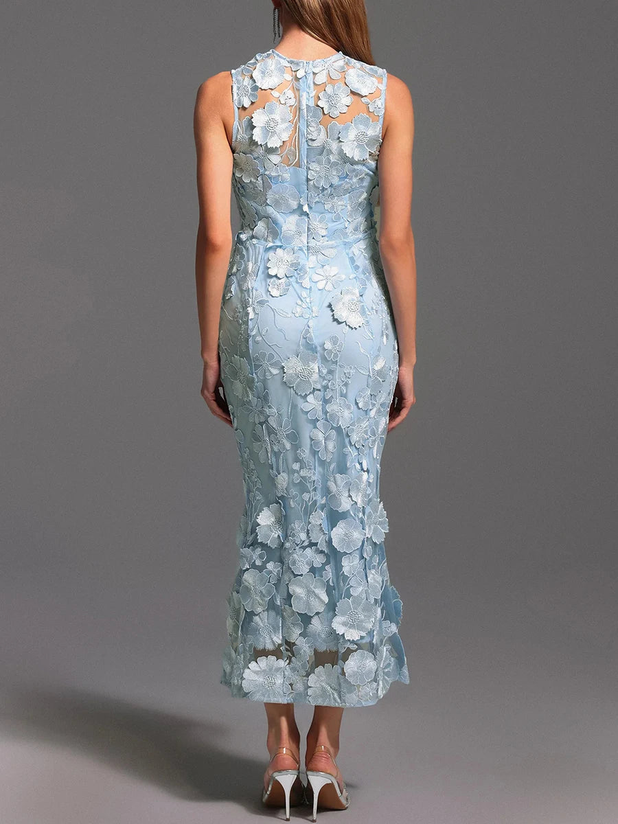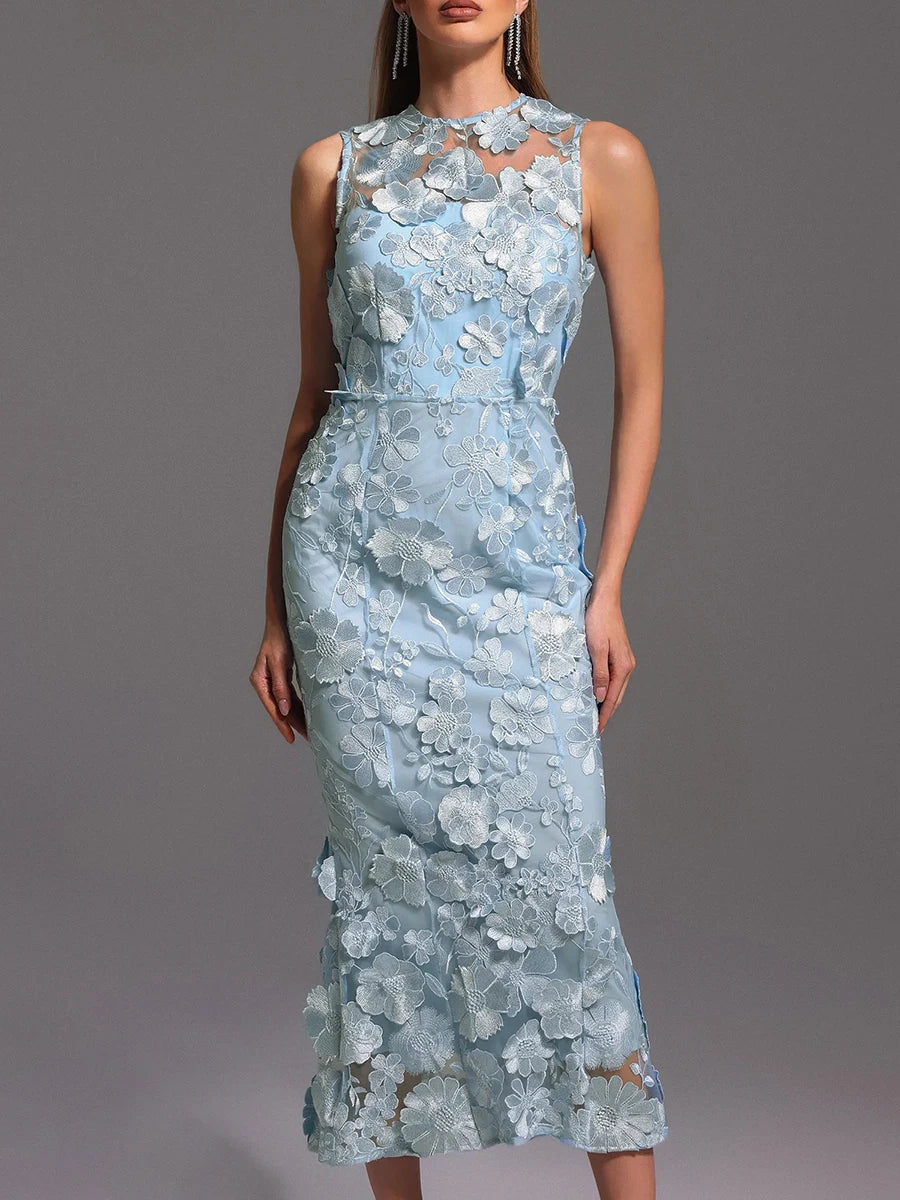 Elevate your elegance with the Trend4us Elegant 3D Floral Lace Midi Dress, a captivating blend of romance and refinement. Crafted from sheer mesh and fully lined through the bodice and skirt, this sleeveless design features exquisite 3D floral embroidery that adds rich texture and dimension. The high illusion neckline and body-contouring fit create a graceful silhouette, perfect for weddings, upscale events, or formal evening affairs.