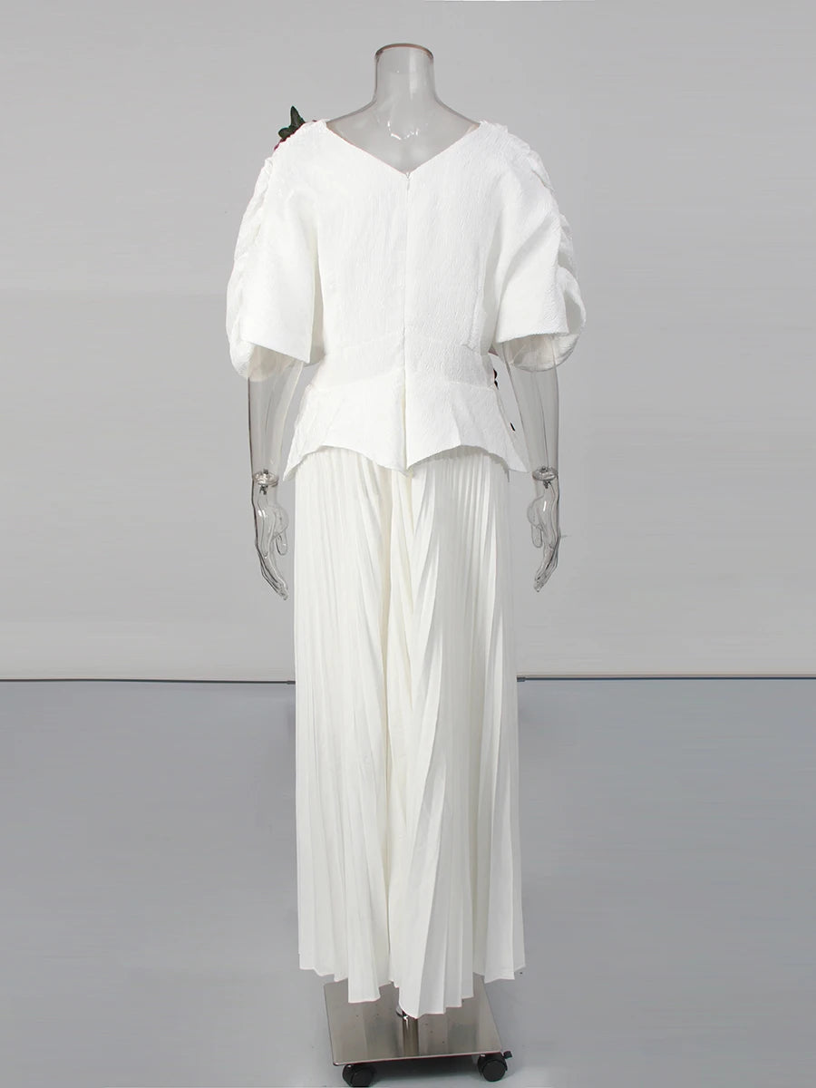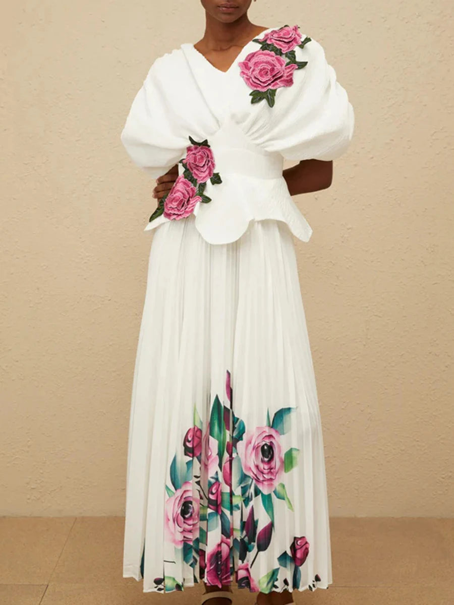 The flowing pleated skirt reveals a romantic rose print near the hem, creating a seamless connection between texture and pattern. Crafted from premium lightweight fabric, it drapes beautifully, offering comfort and sophistication. Perfect for evening galas, formal occasions, and romantic celebrations, this piece captures the essence of luxury with every fold and flourish.