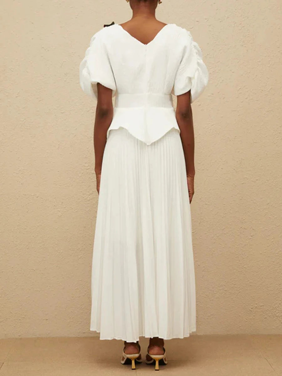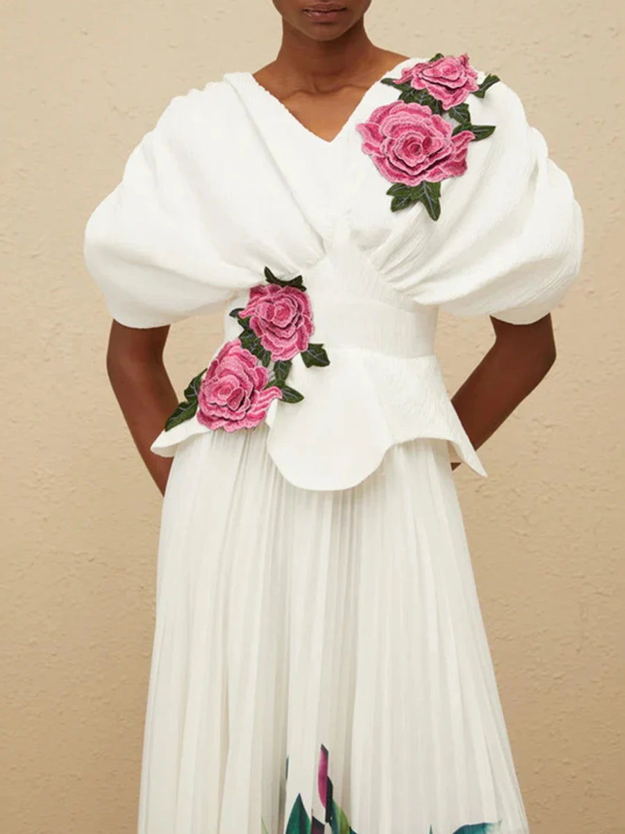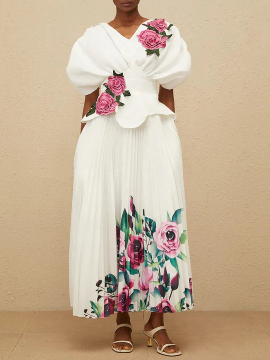Trend4us Elegant 3D Rose Appliqué Pleated Maxi Dress