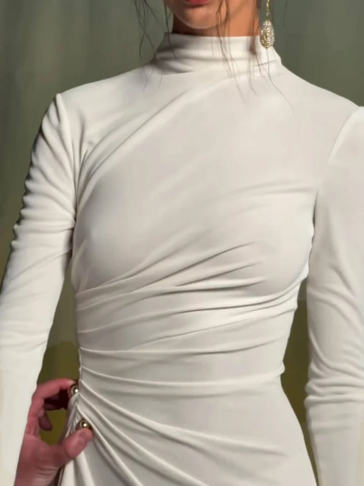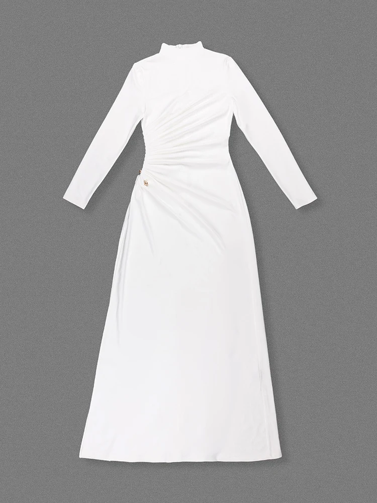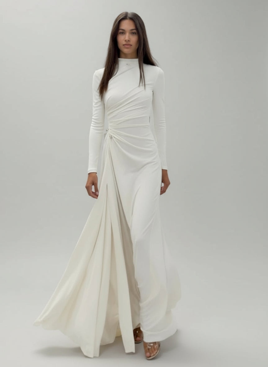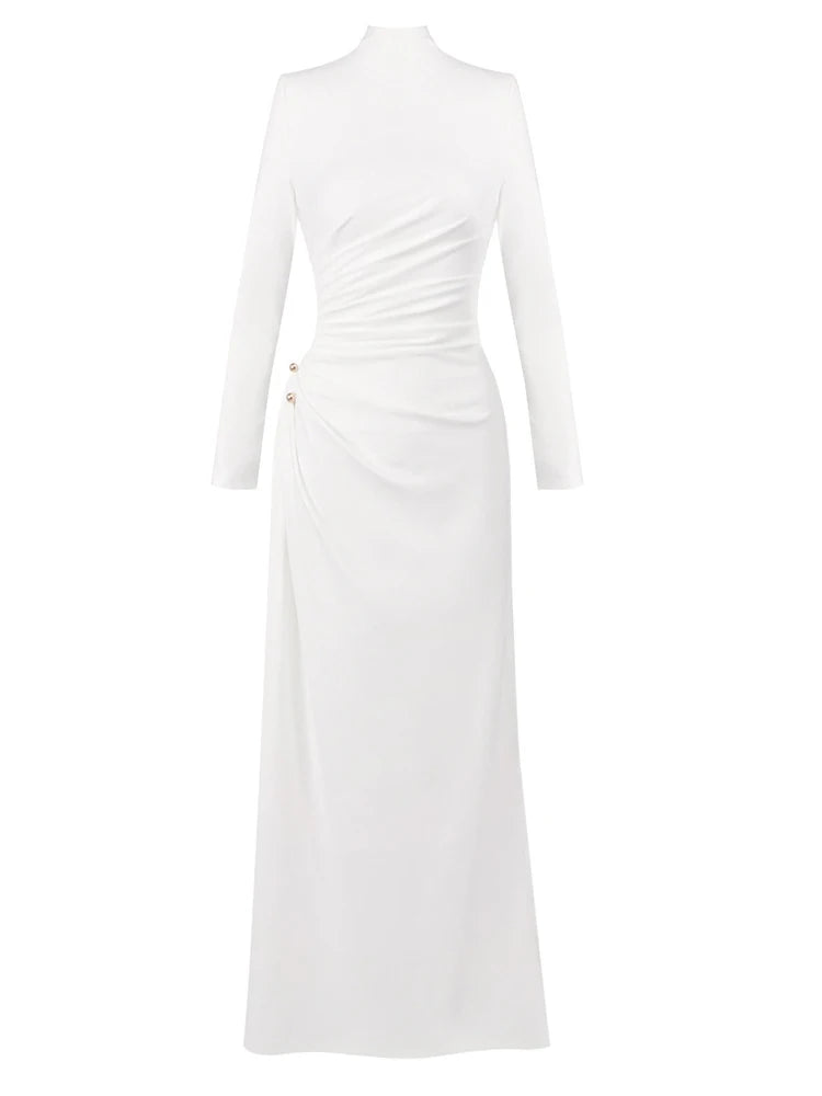 Crafted from a smooth, figure-sculpting stretch fabric, this gown features a graceful high neckline and long sleeves that balance its daring thigh-high slit. The ruched waistline flatters every curve, while the sleek silhouette elongates the body with timeless refinement.