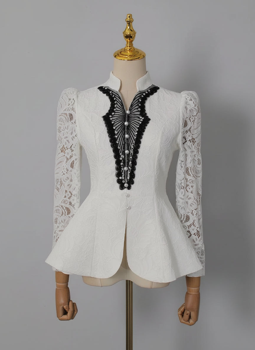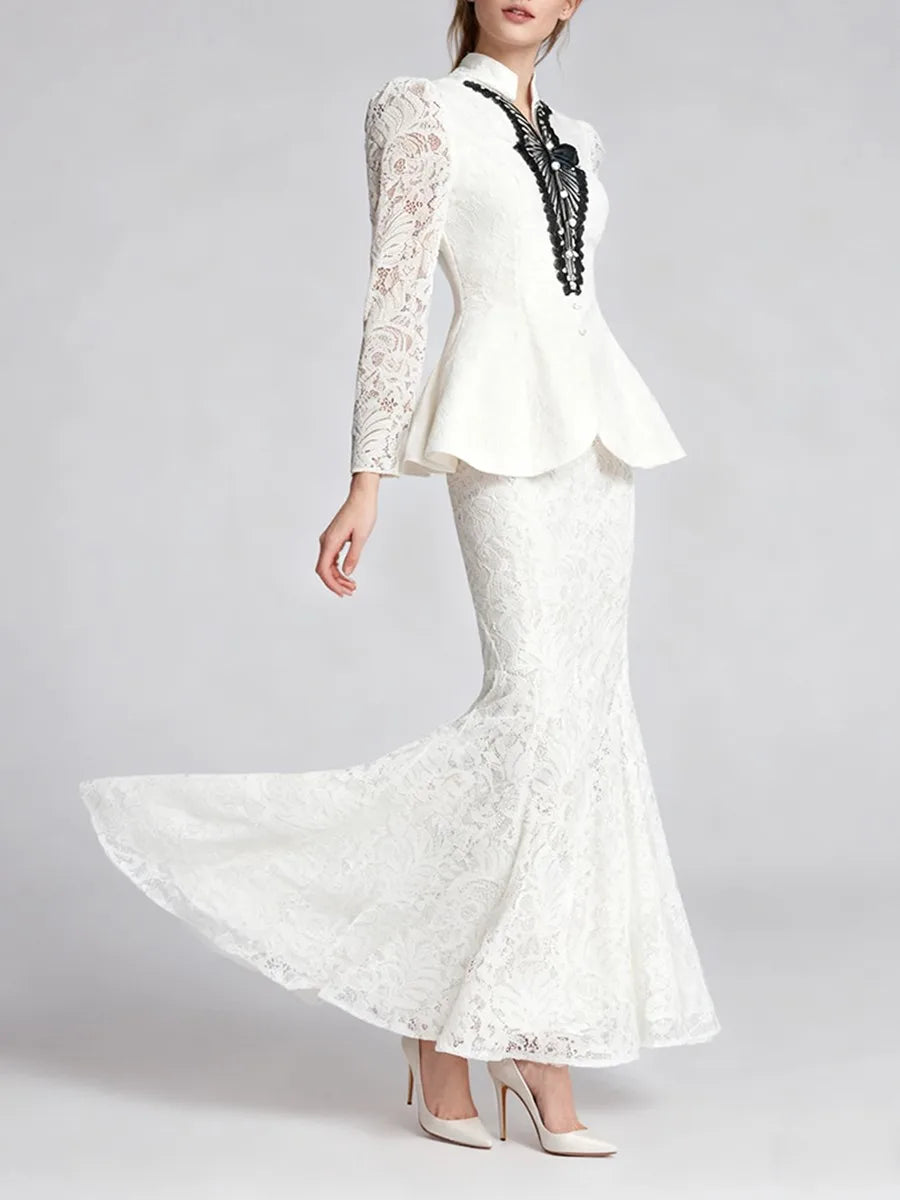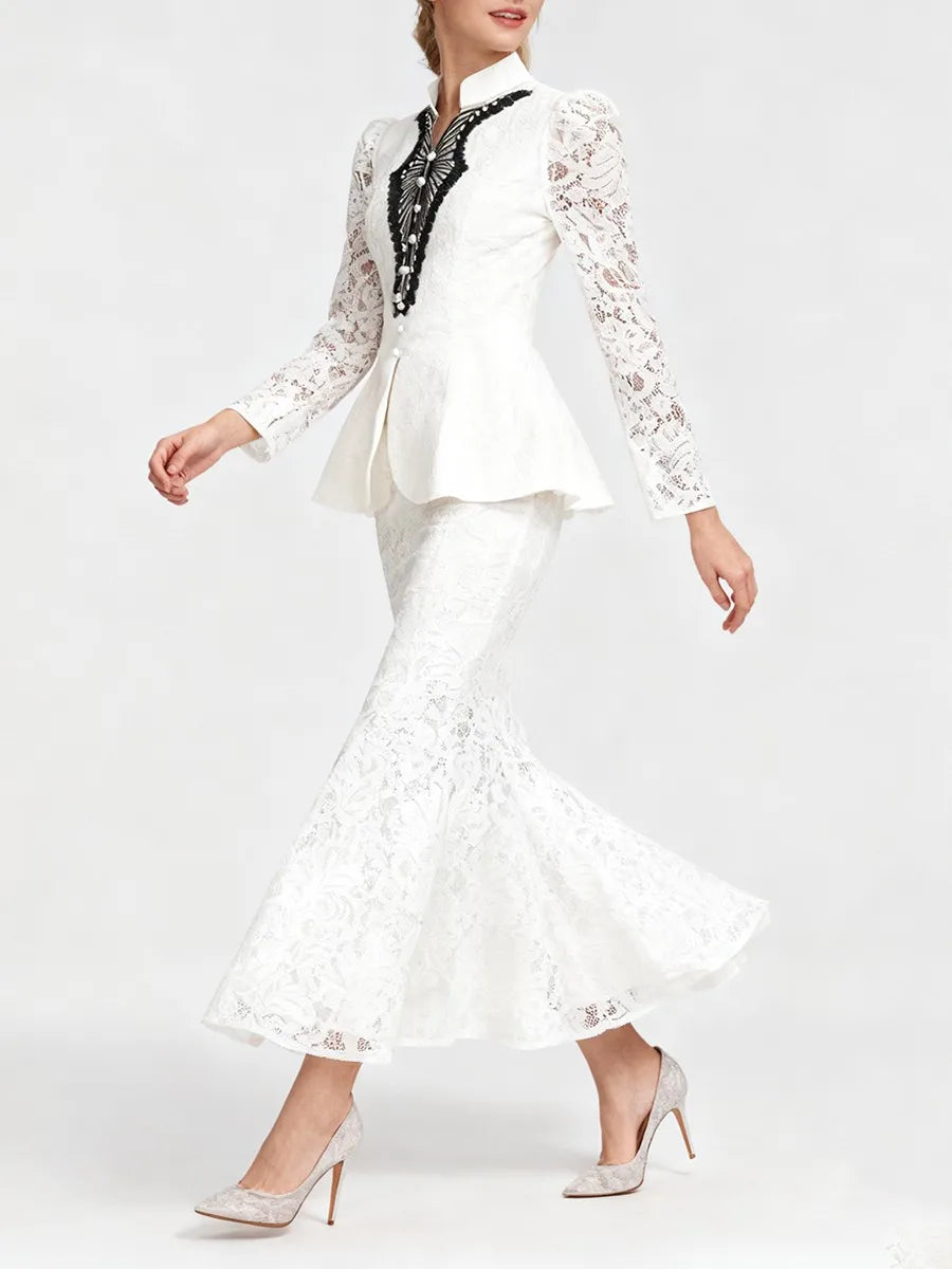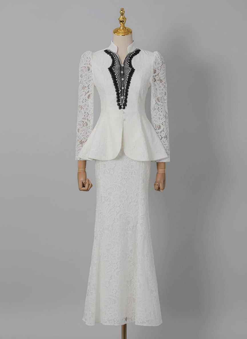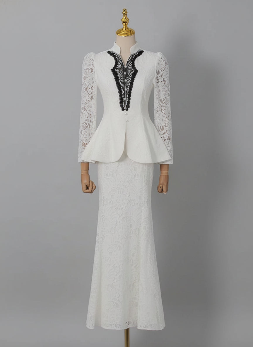 The tailored peplum blazer features delicate lace sleeves, structured shoulders, and a sculpted waist that flatters the figure. Intricate black contrast detailing along the neckline adds a luxurious statement touch, while the matching lace mermaid skirt enhances graceful movement and elegance.