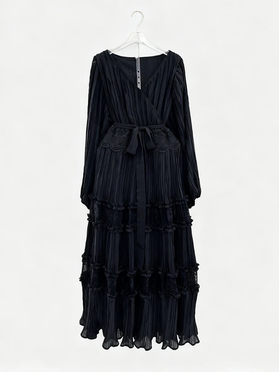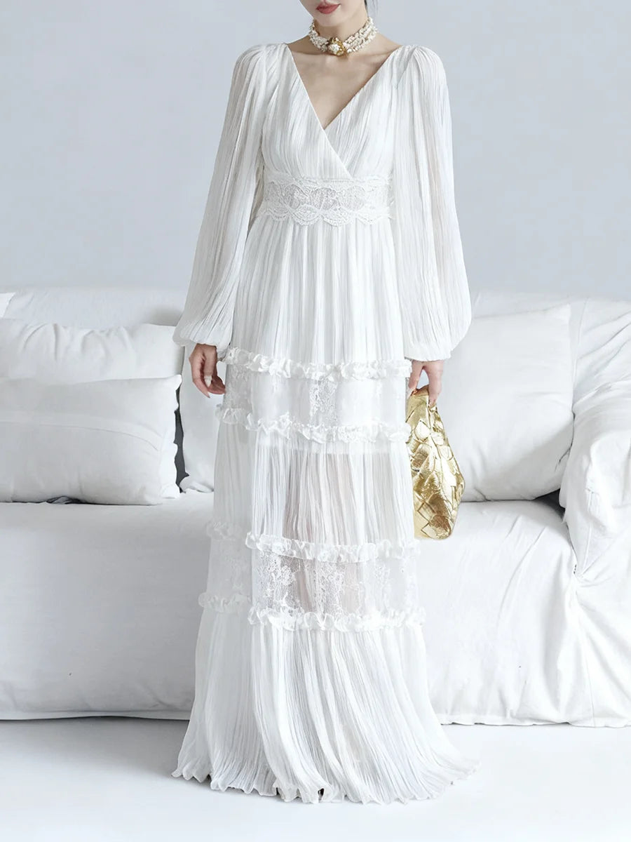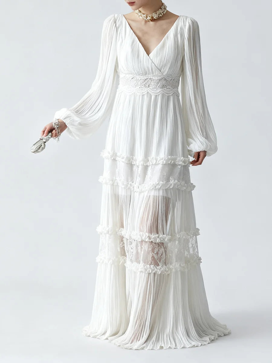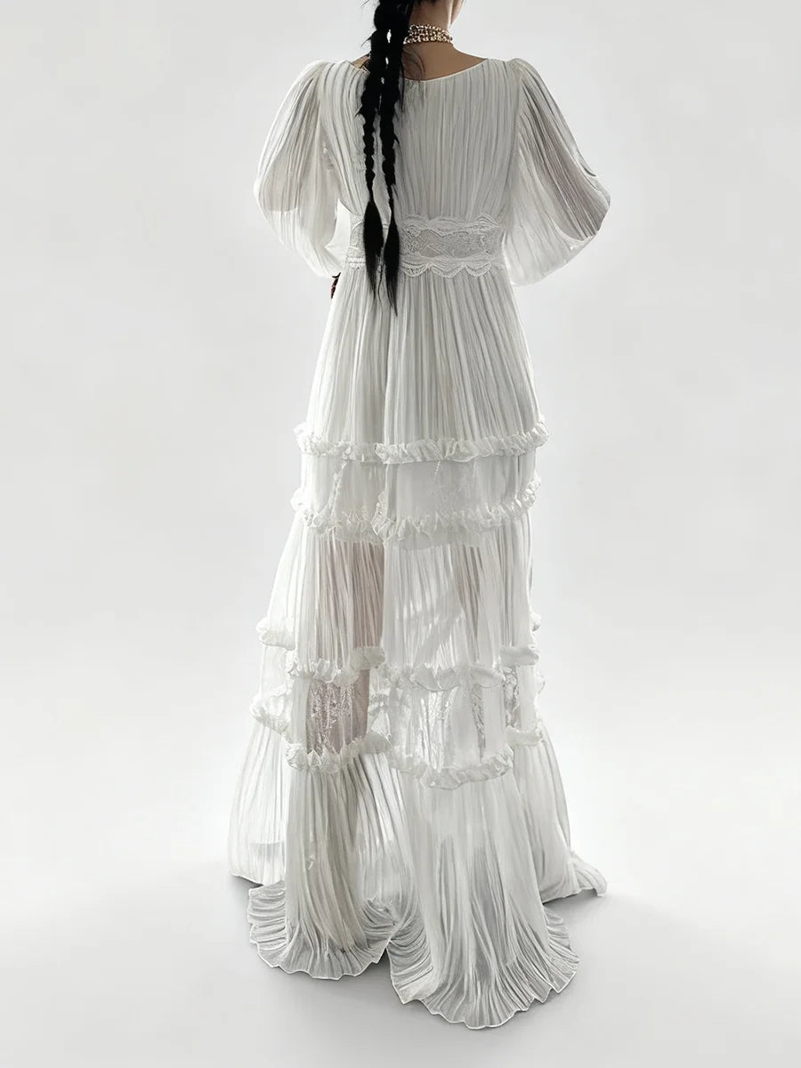 Grace meets timeless sophistication in the Trend4us Elegant Pleated Lace Panel Maxi Dress. This ethereal gown features flowing pleated chiffon, sheer lace inserts, and delicately tiered panels that create an enchanting silhouette. The V-neckline and long bishop sleeves add romantic charm, while the intricate lace waistband flatters the figure with subtle definition.