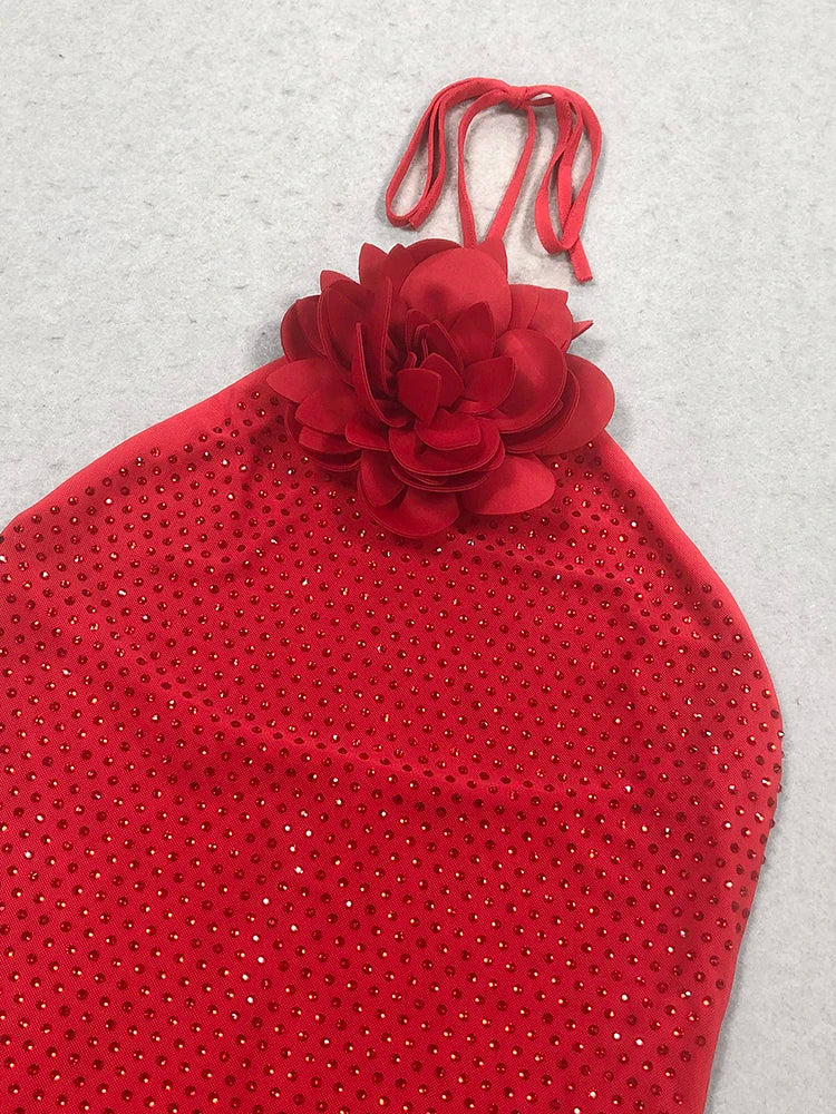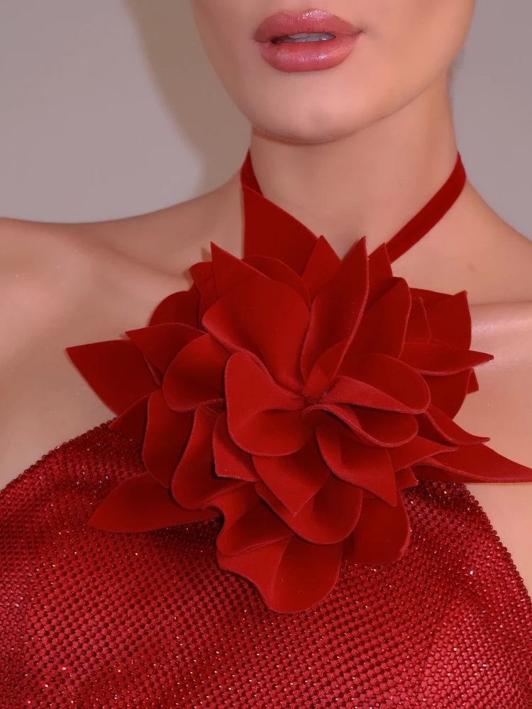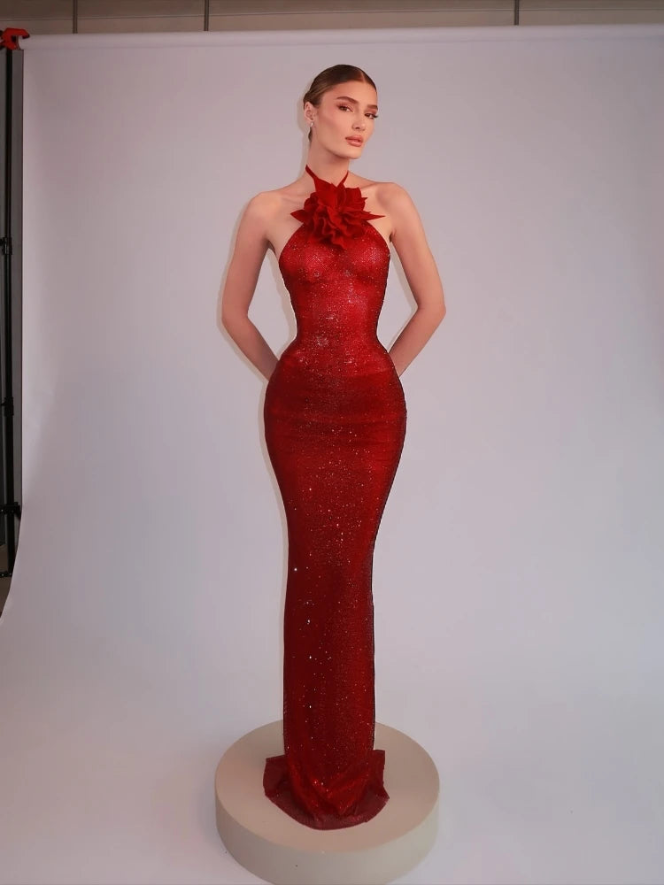 Turn heads in the Trend4us Glam Rosette Sparkle Halter Gown – a showstopping piece designed for elegance and allure. This form-fitting red gown features a shimmering fabric adorned with delicate crystals and a dramatic 3D rosette at the halter neckline. The sleek silhouette hugs your curves, while the backless design and center slit add a touch of sultry sophistication. Perfect for evening events, galas, or red-carpet moments.