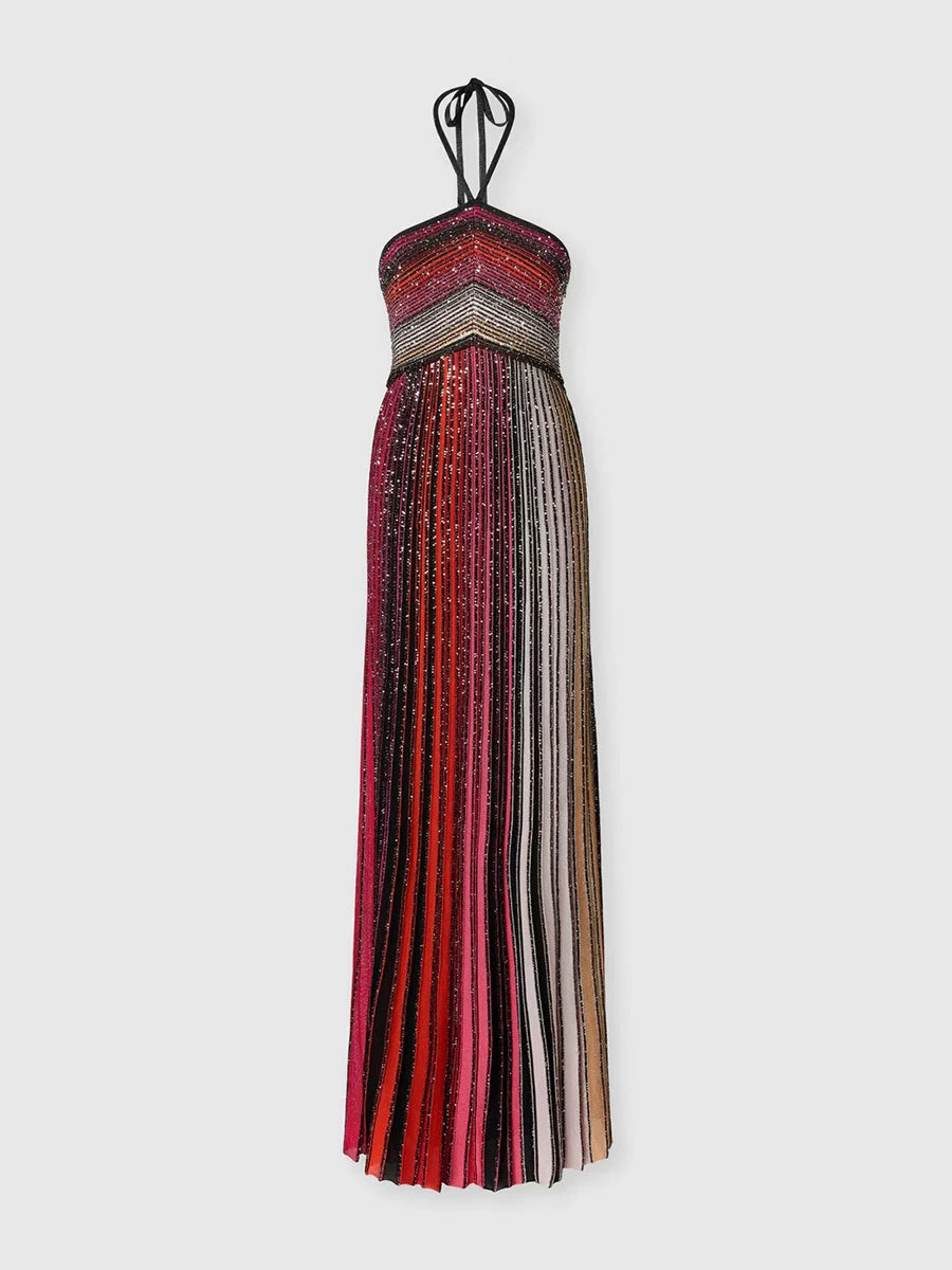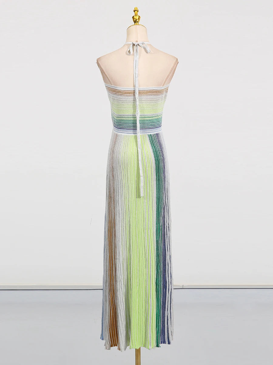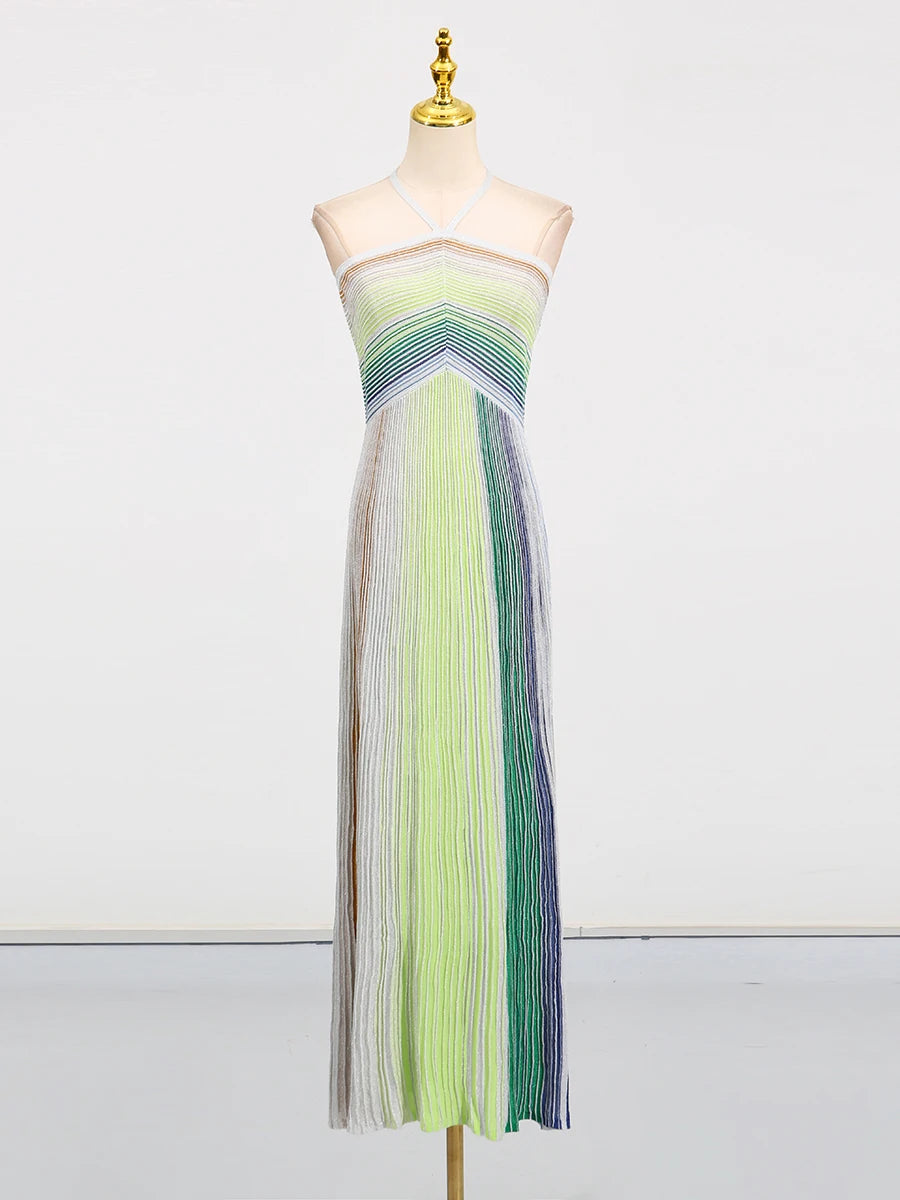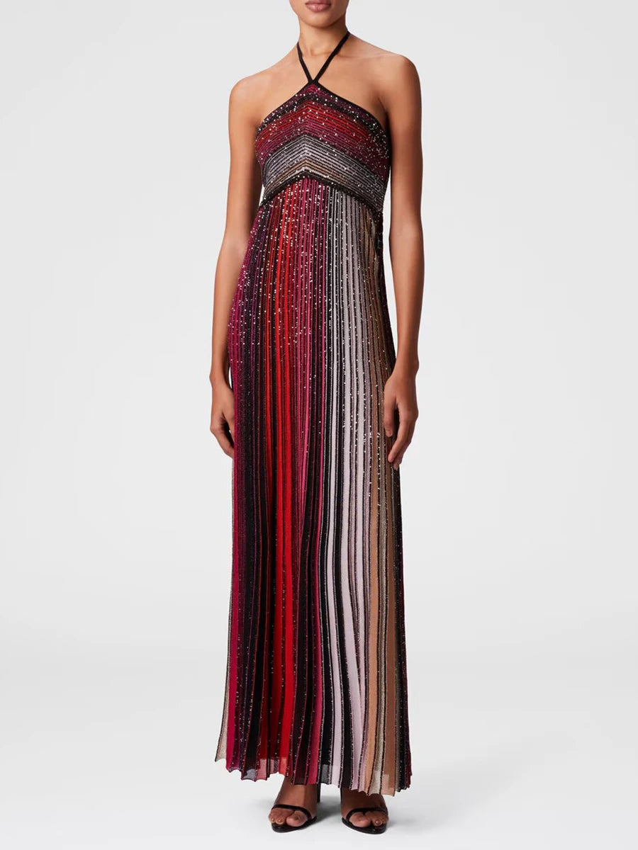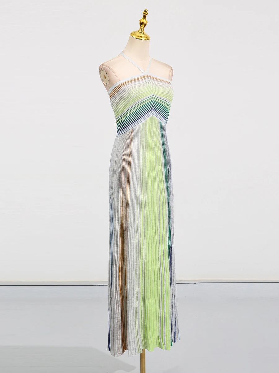 Make a luminous entrance in the Trend4us Halter Pleated Maxi Dress, where movement meets elegance. This knee-length gown features a flattering halter neckline with a fitted bodice that flows into a fully pleated skirt. The gradient stripe pattern shimmers with a subtle sheen, offering a mesmerizing visual effect with every step. Ideal for evening events, galas, and destination weddings, this dress delivers modern glamour with effortless grace.
