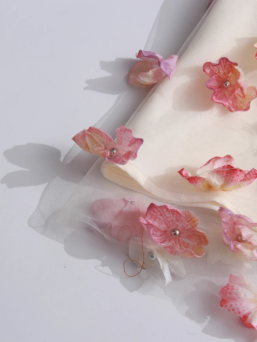 Details: Hand-sewn 3D floral appliqués with pearl embellishments