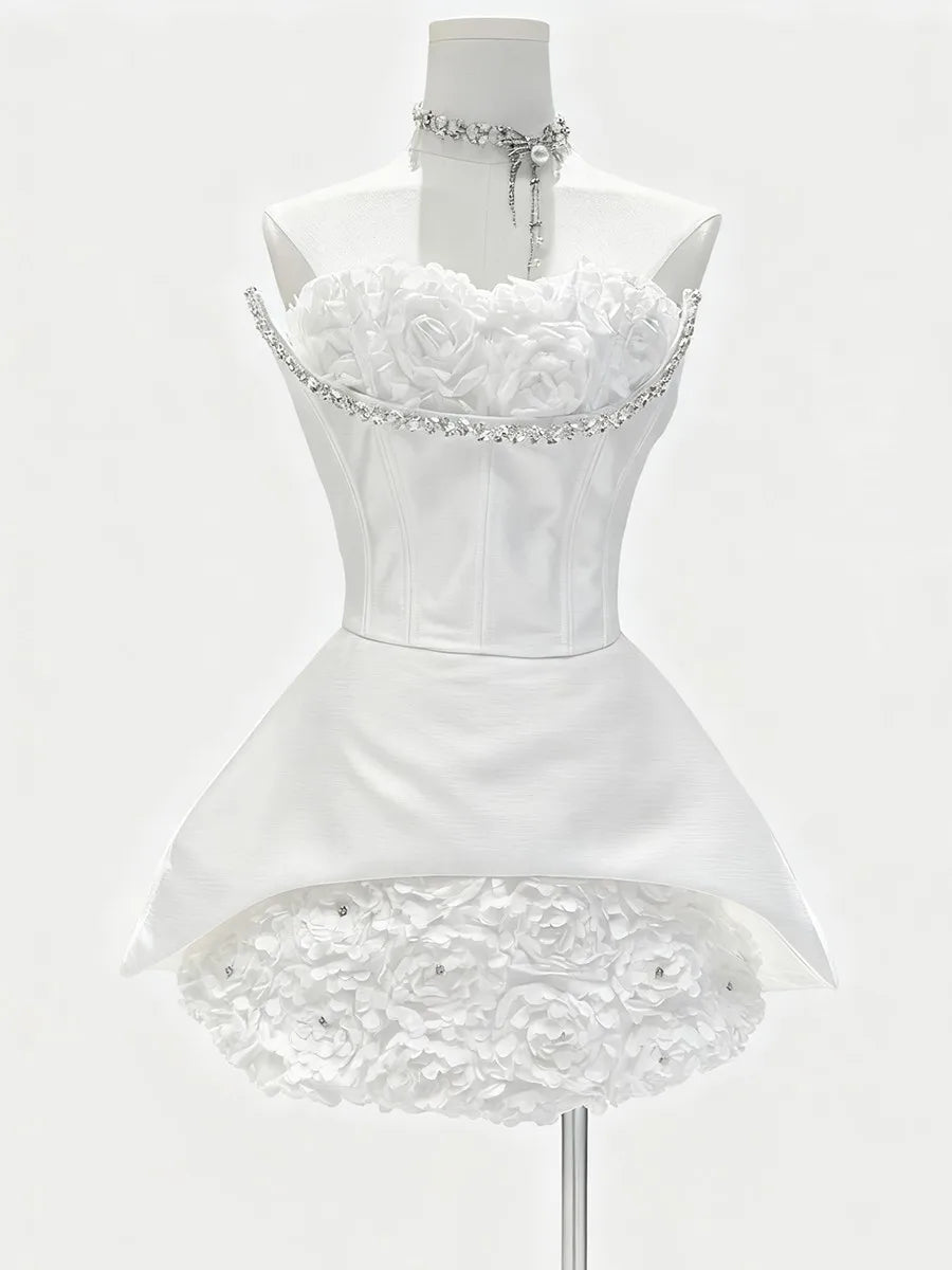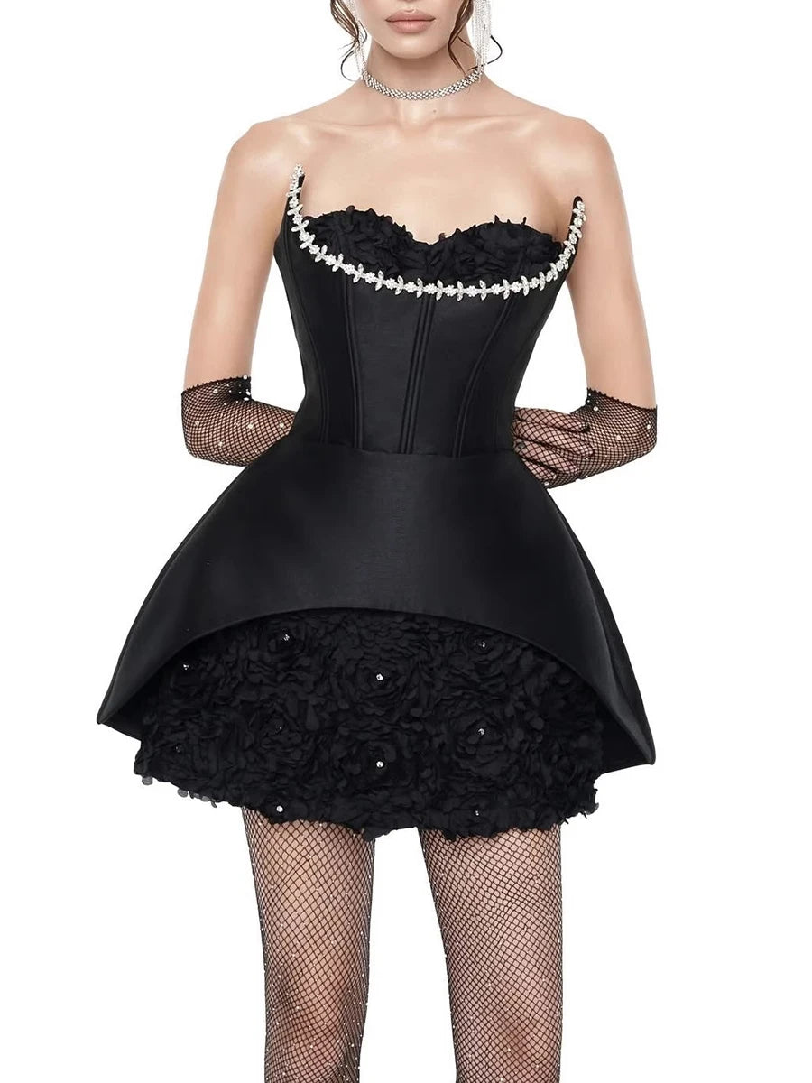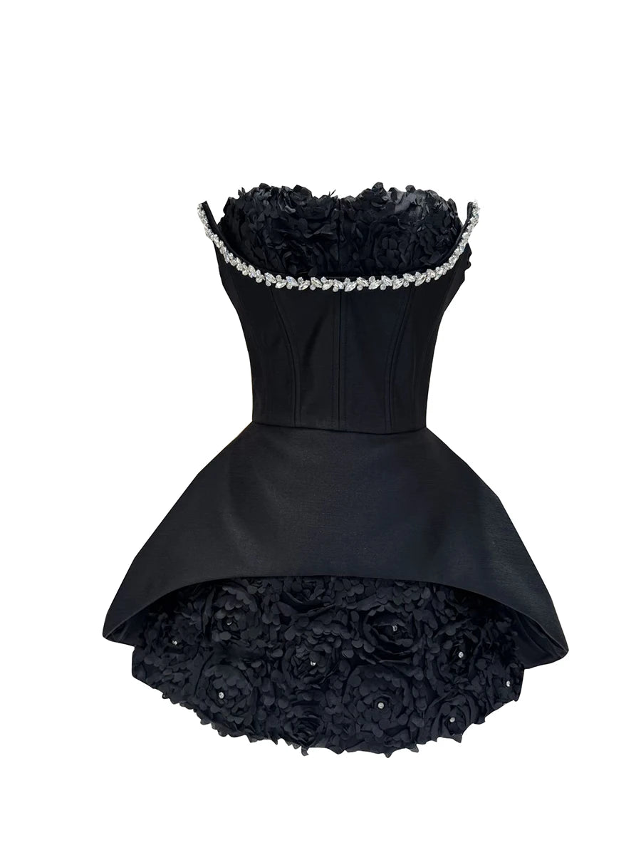 Turn every head in the room with the Trend4us Luxe 3D Floral Corset High-Low Mini Dress, a masterpiece of modern couture elegance. This sculpted silhouette combines an intricately detailed 3D floral skirt with a structured corset bodice, creating the perfect harmony between femininity and power.
