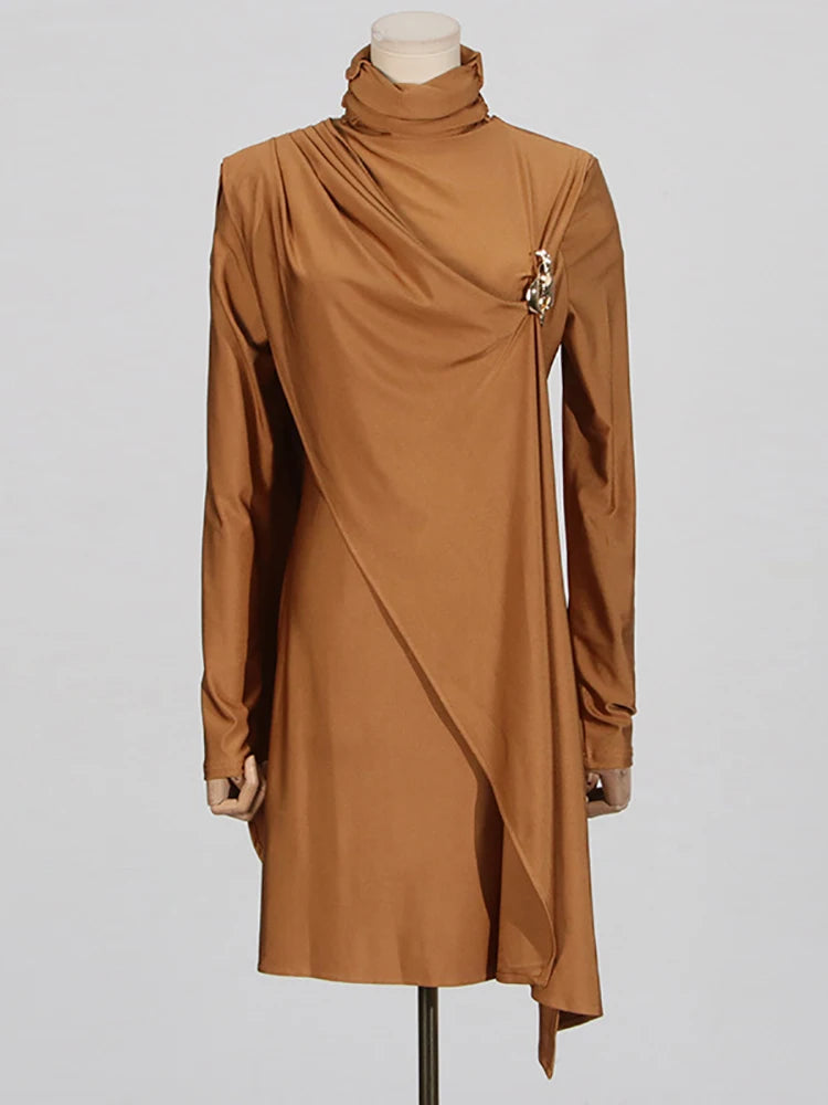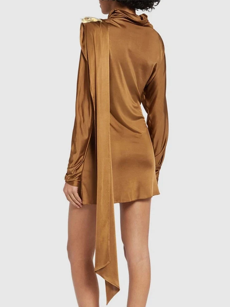The high neckline and long sleeves add a refined touch, while the asymmetrical hem and gathered shoulder detail bring a bold and fashion-forward aesthetic. A striking gold-tone embellishment on the shoulder adds a hint of opulence, making this dress perfect for high-end events, cocktail parties, and exclusive soirées.