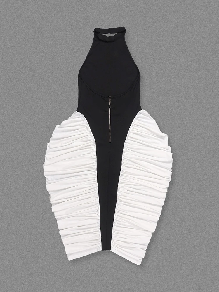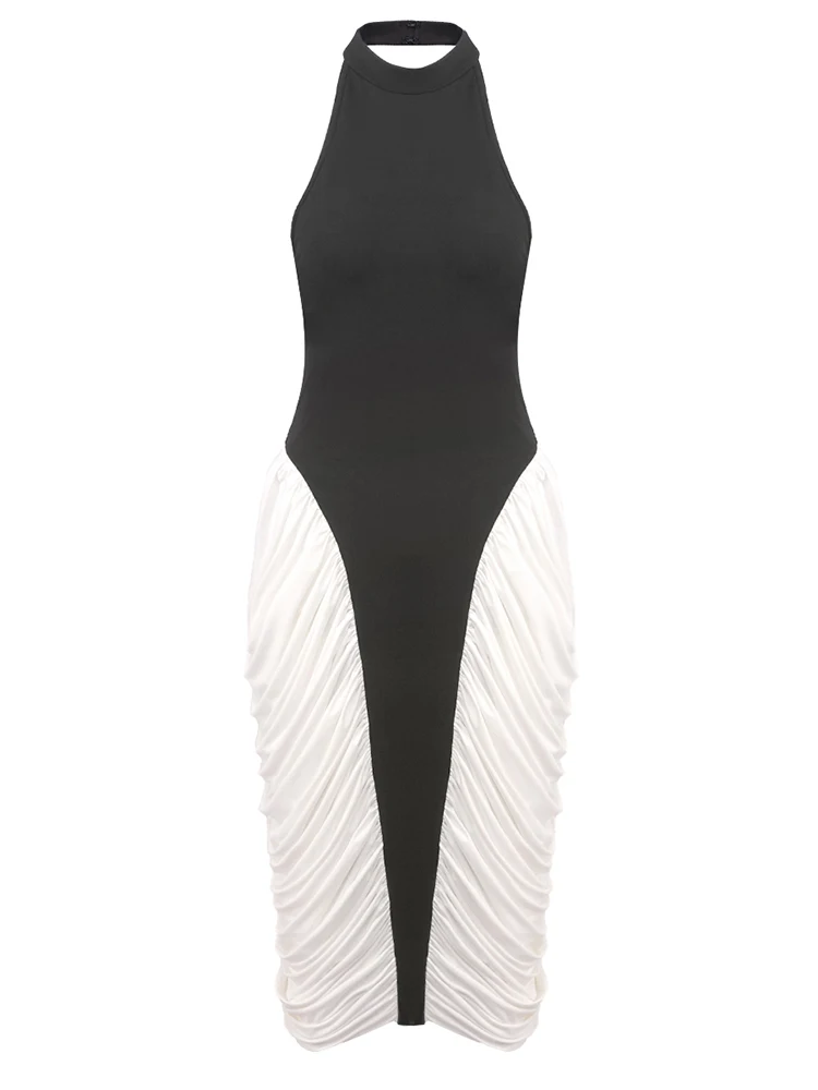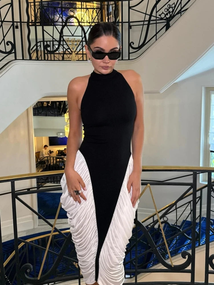 Elevate your evening style with the Trend4us Luxe Backless Contrast Halter Ruched Midi Dress. This striking piece features a bold black halter bodice with a sleek high neckline, beautifully contrasted by ruched ivory side panels that create a sculpted hourglass silhouette. Designed with a daring open back and figure-enhancing fit, this dress exudes modern sophistication and timeless elegance. Perfect for cocktail parties, galas, and upscale dinners, it’s a head-turning statement piece for your wardrobe.