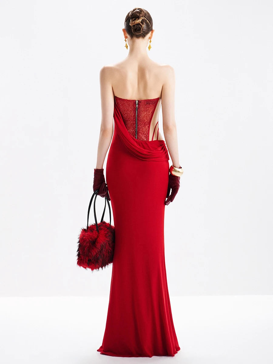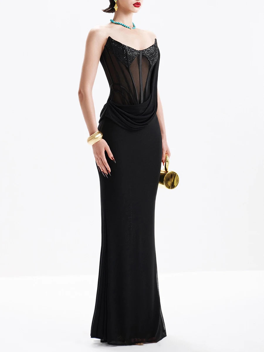 Command attention in the Trend4us Luxe Draped Corset Cutout Evening Gown, a masterpiece of seductive elegance and couture craftsmanship. This gown features a sculpting corset bodice with sheer mesh paneling and sparkling embellishments, offering a striking hourglass effect. The asymmetric draped overlay creates fluid movement and adds a touch of high-fashion drama. Finished with a sleek floor-length silhouette and a daring open back, it’s the perfect look for gala nights, luxury soirées, holiday celebrations, and red-carpet entrances.