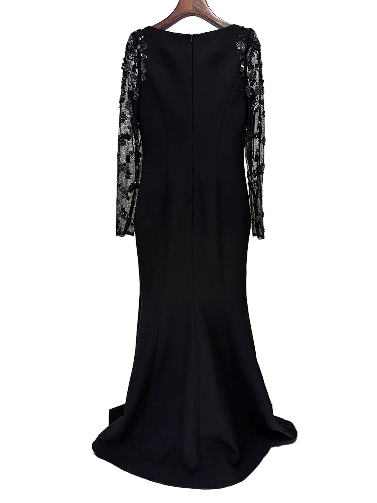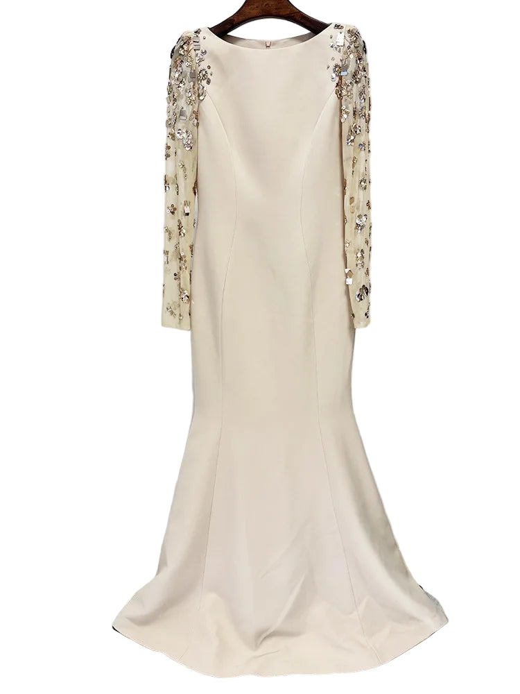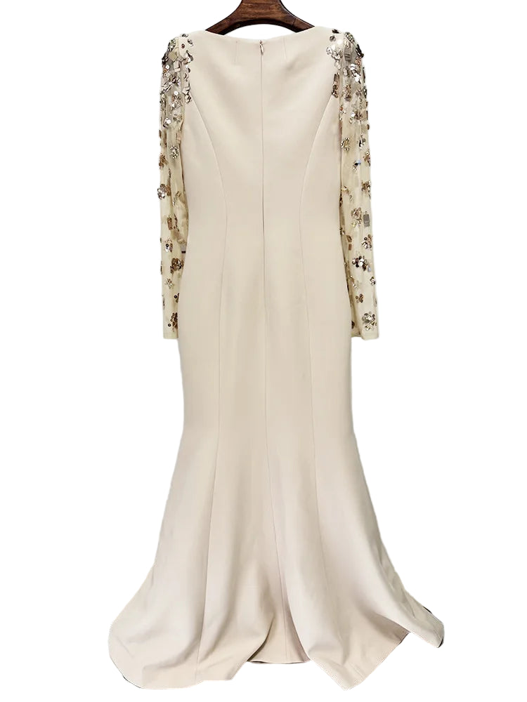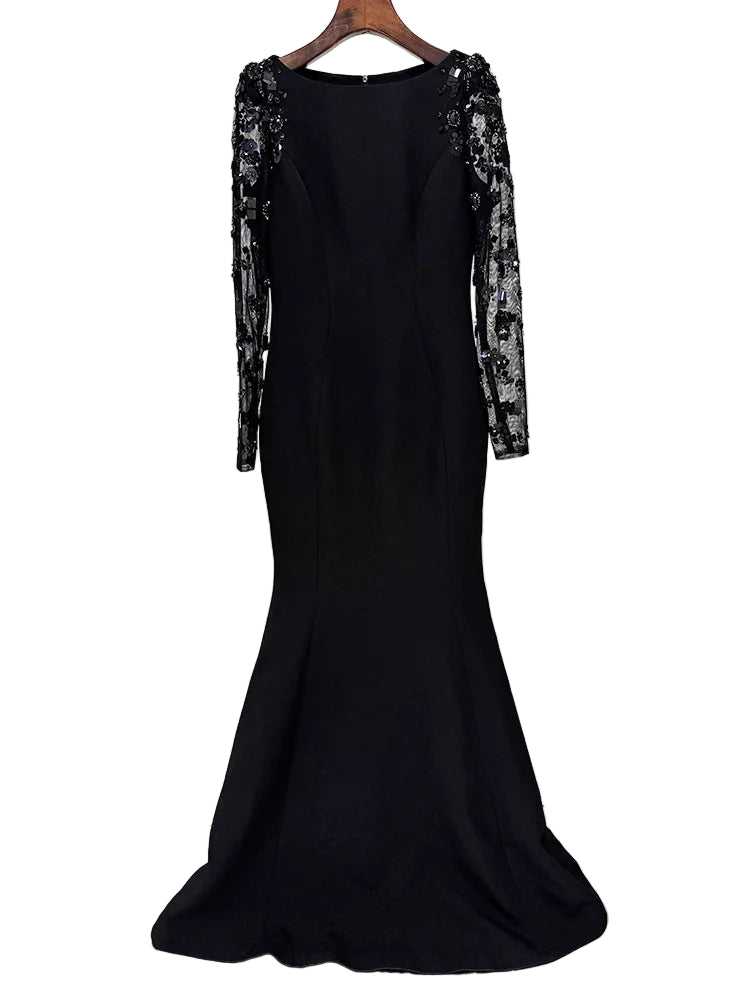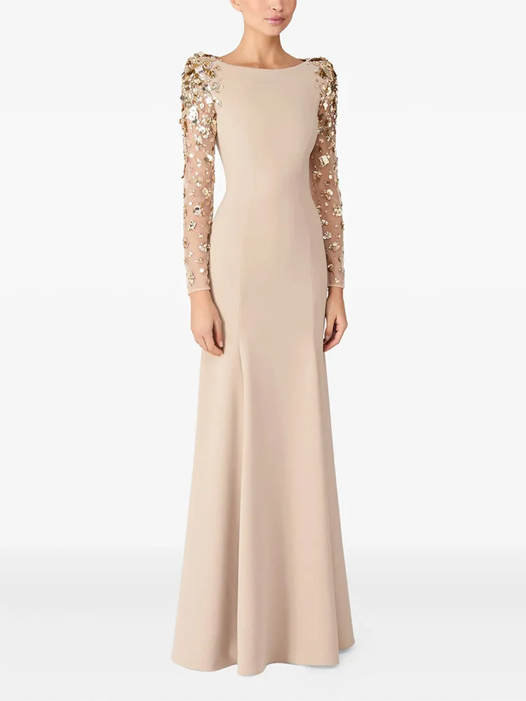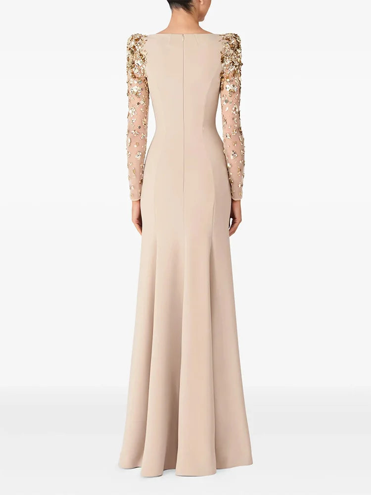 A vision of timeless elegance, this gown combines a sleek, sculpted silhouette with lavish embellishment for a truly sophisticated statement. Designed with a graceful floor-length flare and a classic bateau neckline, it features sheer illusion sleeves adorned with intricate floral beadwork, sequins, and crystals that shimmer beautifully under the light.