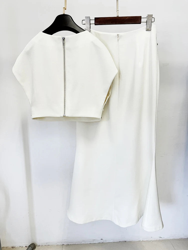 Make a breathtaking statement with the Trend4us Luxe Embellished Shell Appliqué Two-Piece Set, a stunning ensemble designed for those who appreciate artistry and sophistication. This elegant set features a structured crop top with a boat neckline and wide-cut sleeves, paired with a high-waisted maxi skirt. Both pieces are adorned with meticulously placed shell appliqués and crystal embellishments, creating a unique, ocean-inspired look.
