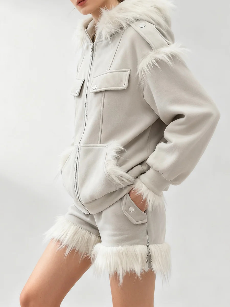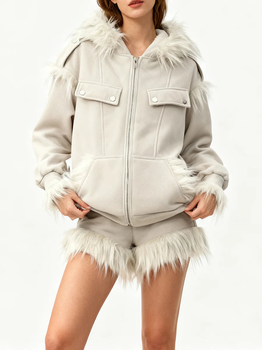 The plush zip-up jacket features a hood trimmed with fluffy faux fur, snap-button pocket flaps, and fur-detailed cuffs for an effortlessly glam finish. The matching high-waisted shorts mirror the look with faux fur edging, adding playful texture and sophistication.