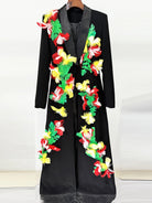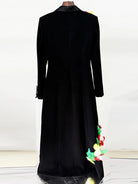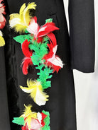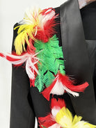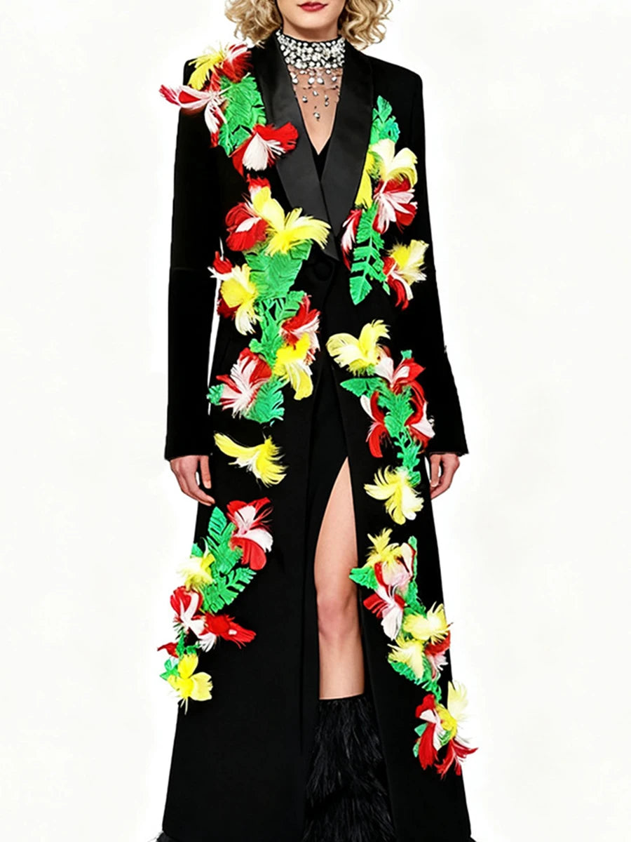Turn every entrance into a runway moment with the Trend4us Luxe Feather Appliqué Statement Long Blazer Coat. This extraordinary piece combines tailored sophistication with bold, artistic detailing. Crafted from a sleek black fabric, the coat features vibrant hand-placed feather appliqués in red, yellow, white, and green — creating a dramatic, couture-inspired visual flow along the front.