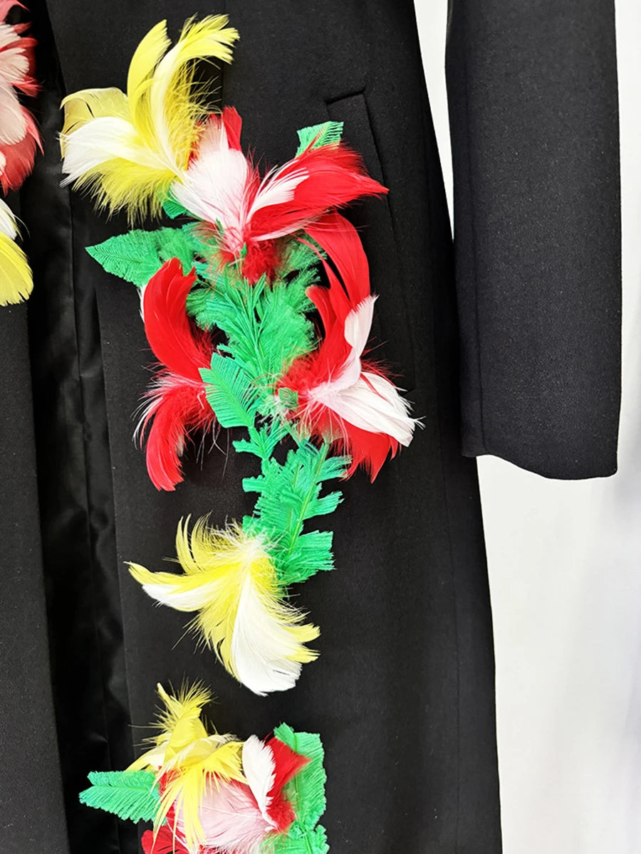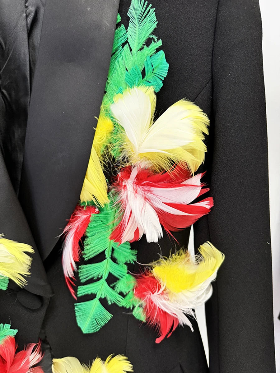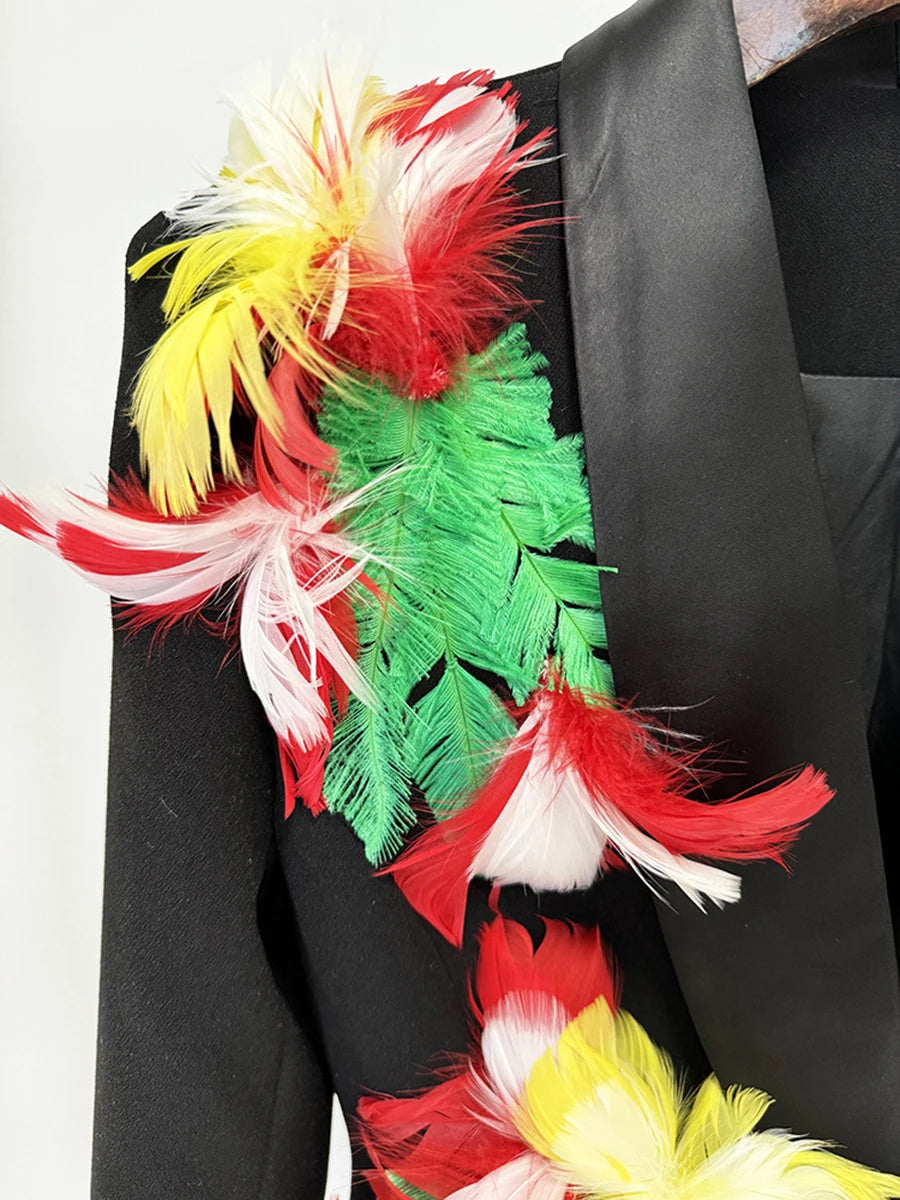 The structured silhouette, longline cut, and satin lapel add premium refinement, while the colorful feather arrangement delivers a high-fashion pop of texture and movement. A true showstopper for red carpets, performances, galas, fashion events, and editorial styling.