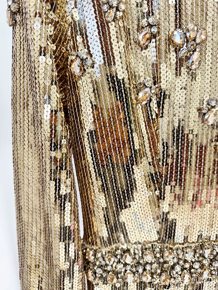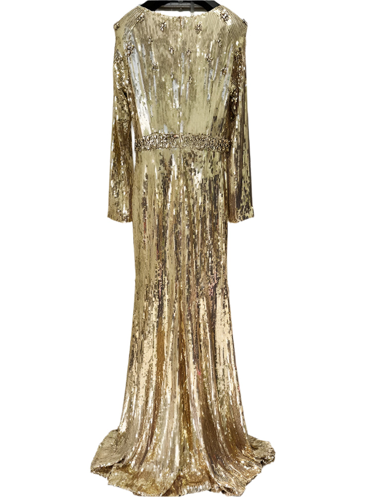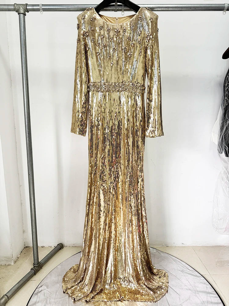Command attention in the Trend4us Luxe Gold Sequin Crystal Embellished Evening Gown—a dazzling masterpiece designed for grand entrances. This full-length gown features a figure-hugging silhouette adorned with radiant gold sequins from shoulder to hem. The structured shoulders and long sleeves add a powerful elegance, while the neckline and waist are intricately embellished with clustered crystals and gemstones, forming a luxurious focal point. A subtly flared skirt adds movement and grace to every step, making this gown the ultimate statement piece for galas, red carpet events, and black-tie occasions.