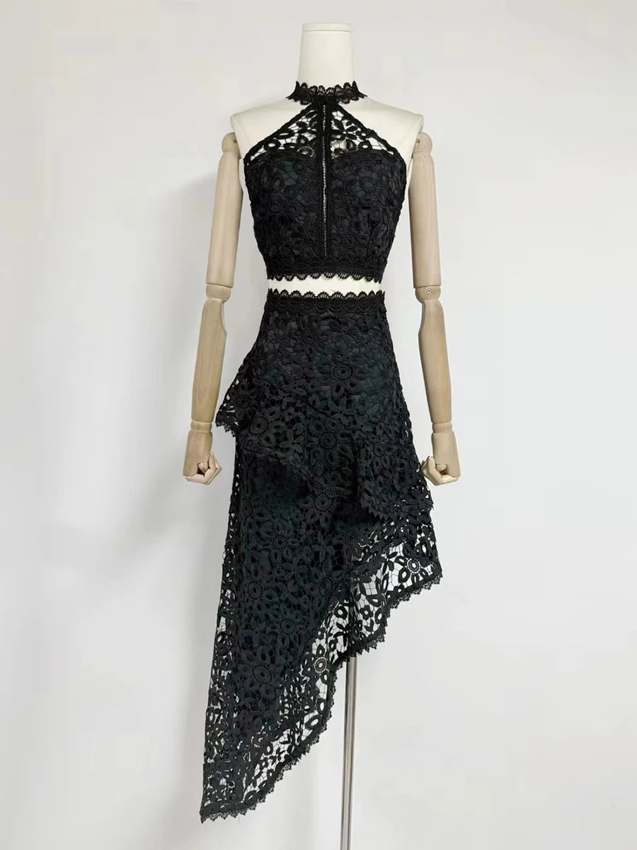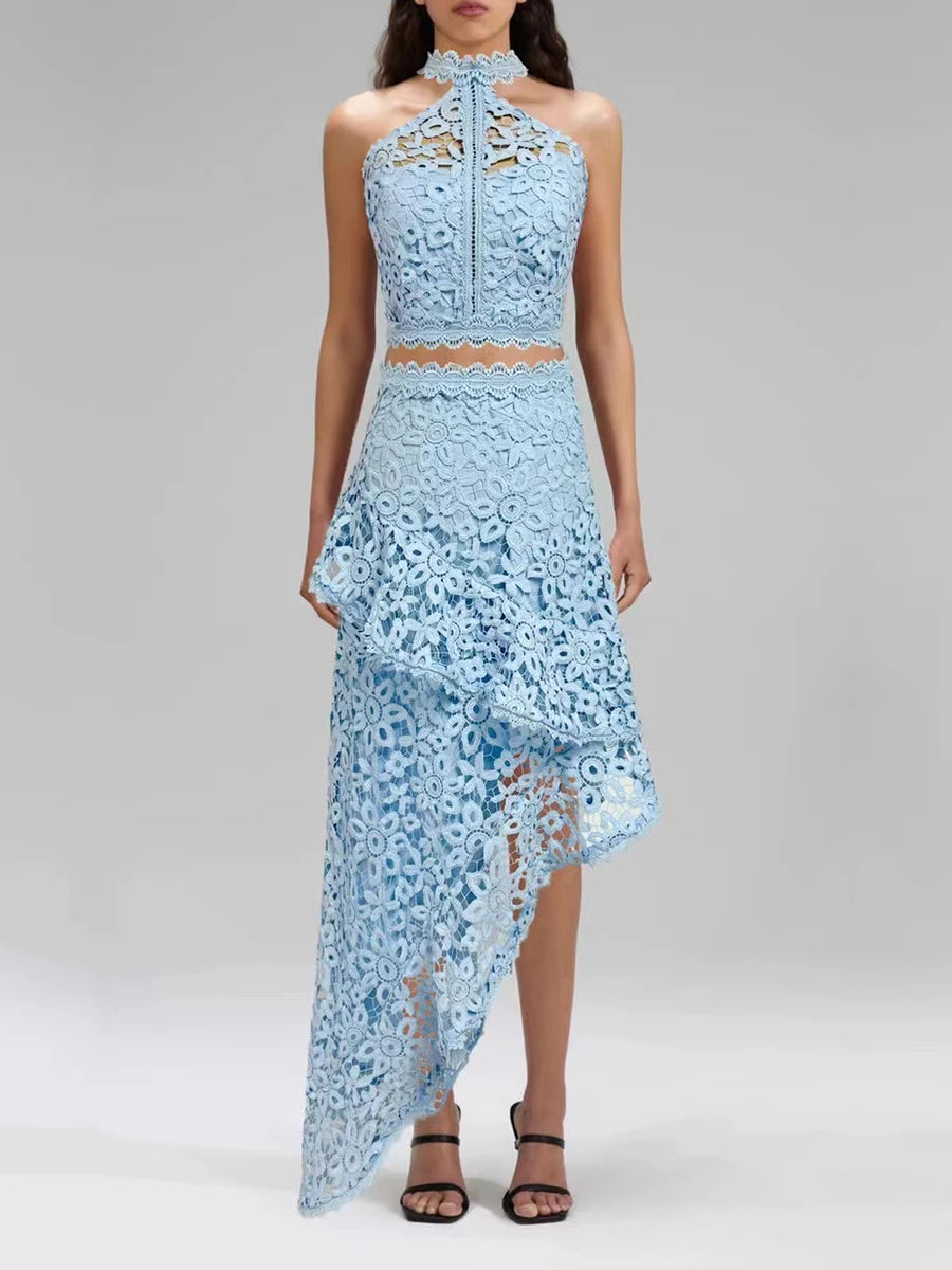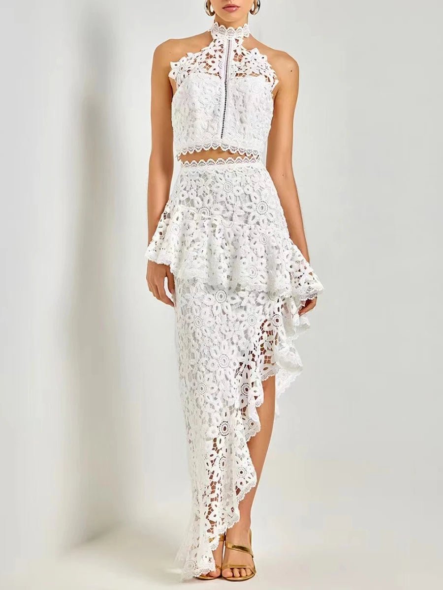 Make an unforgettable statement in the Trend4us Luxe Lace Halter Crop & Skirt Set, featuring intricate floral lace embroidery and a flattering halter neckline. The high-neck crop top is beautifully detailed with scalloped edges and a center cutout, while the asymmetrical ruffled lace skirt adds a romantic, flowing silhouette. Perfect for garden parties, bridal showers, or elegant soirées, this two-piece set blends sophistication and allure with every step.