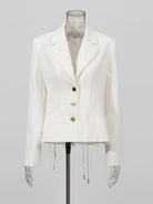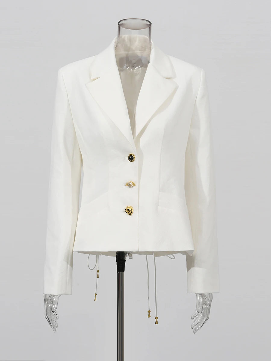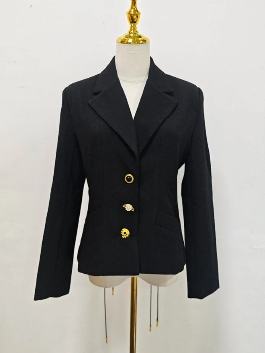 Elevate your wardrobe with the Trend4us Luxe Lace-Up Back Gold Button Blazer — a statement piece that fuses sophistication with couture-inspired detailing. Crafted from premium structured fabric, this blazer features an elegant fitted silhouette adorned with gold-tone buttons at the front and sleeves. The highlight lies in its striking lace-up back design with metallic grommets and adjustable ties, adding a bold yet refined touch. Perfect for formal occasions, high-end events, or luxury streetwear styling, this blazer embodies power, poise, and precision tailoring.