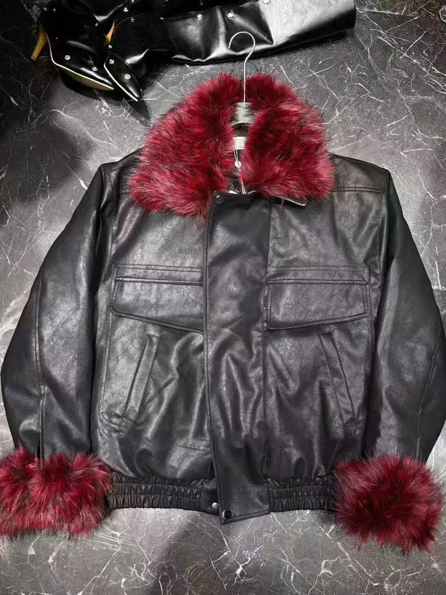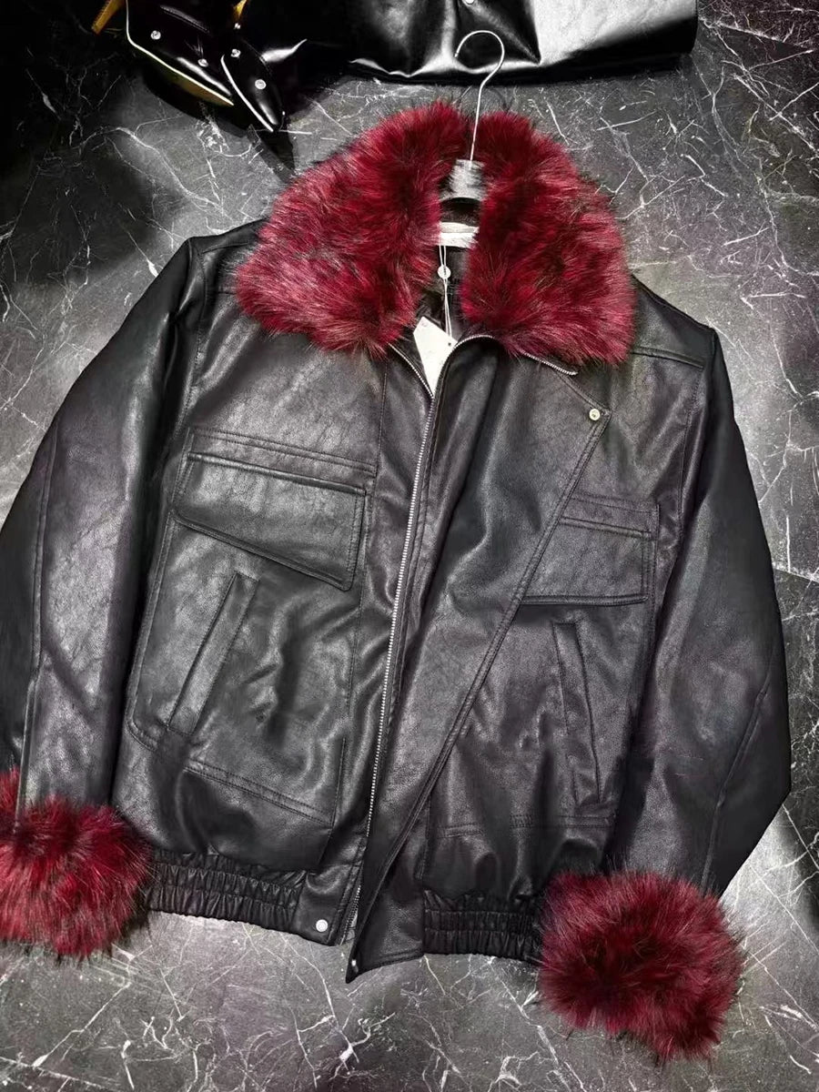 The Trend4us Luxe Modern Leather Faux Fur Jacket embodies bold sophistication with a modern edge. Designed from premium faux leather, this cropped jacket features plush wine-red faux fur accents at the collar and cuffs, adding a rich contrast to its sleek black base.