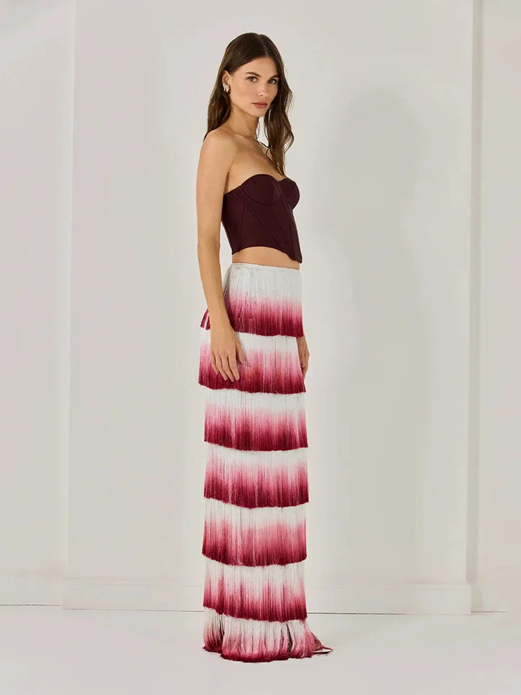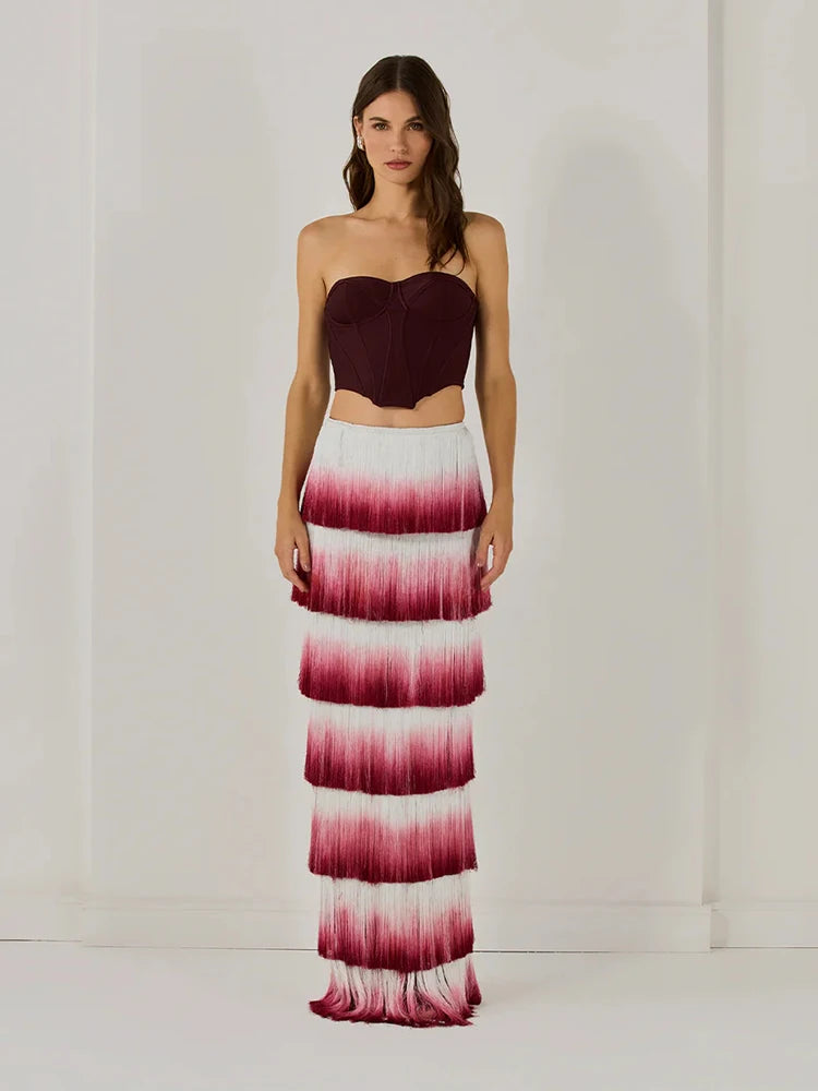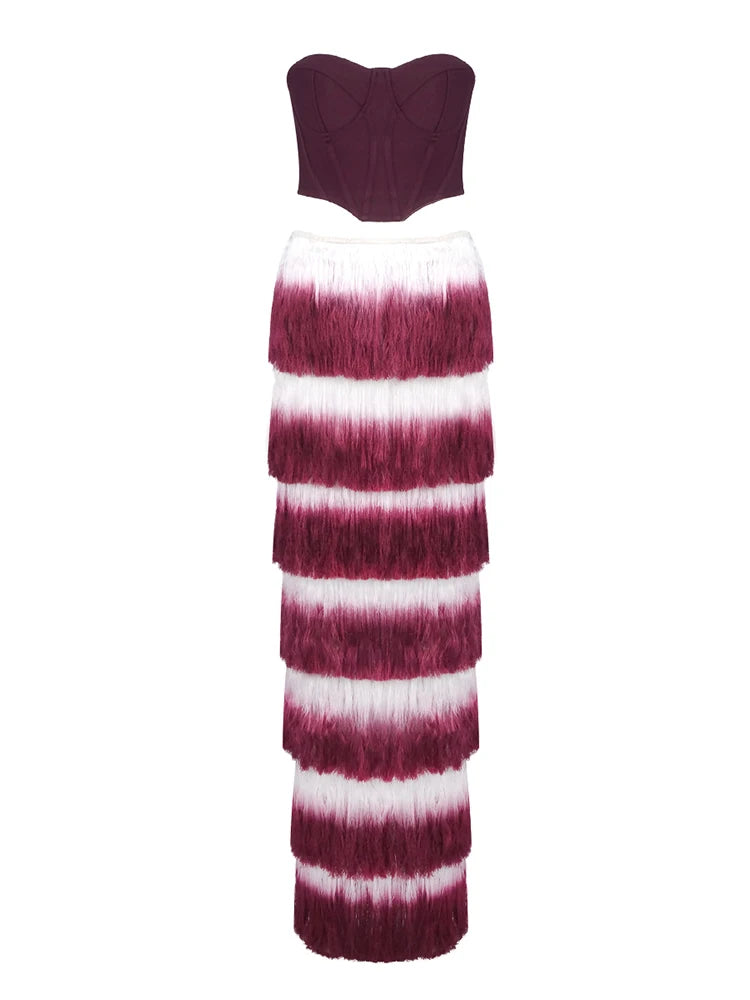 Command attention in the Trend4us Luxe Ombre Fringe Strapless Corset Two-Piece Set, a head-turning ensemble that fuses structure and movement with effortless glamour. The set features a sculpted strapless corset top in deep burgundy, designed with contoured seams and a flattering curved hem to accentuate the waist. Paired with a dramatic high-waisted maxi skirt, the tiered ombre fringe cascades from white to rich wine tones in layered perfection—creating fluid motion with every step.