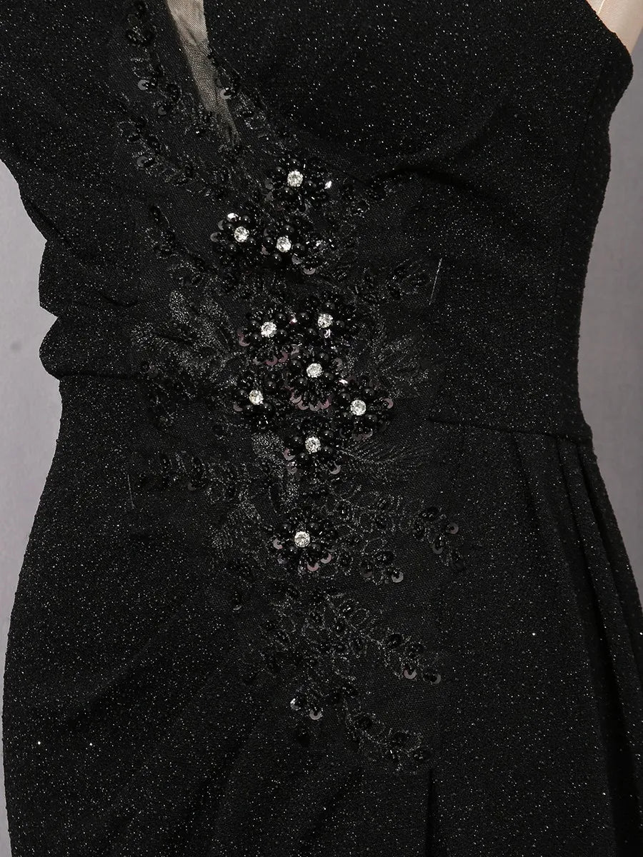 Crafted from shimmering stretch fabric that hugs the silhouette with elegance, this gown features a dramatic one-shoulder neckline and a daring thigh-high slit that exudes confidence. Intricate crystal and sequin embellishments cascade along the bodice, enhancing its sculpted form and adding a mesmerizing sparkle under the lights.